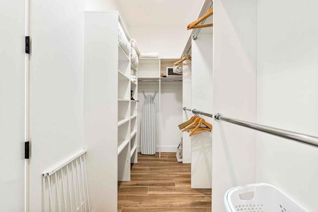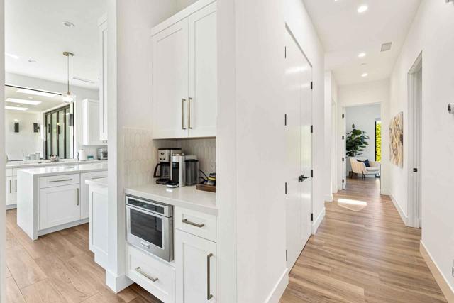 New co-ownership opportunity: Own one-eighth of this turnkey home, professionally managed by Pacaso. The all-white exterior emphasizes the clean, modern design, complemented by faux turf lawns, a pool with aqua tones, and contemporary black-trimmed windows with concrete slab walkways. Privacy walls and a gated entrance enhance comfort around the pool area, which features multiple water elements and a multi-colored light system. A poolside fire pit offers views of the surrounding mountains. Sliding doors from both the front and rear yards open to a spacious interior with an open-concept living and dining area centered around a sleek fireplace wall. White walls and plank tile flooring extend throughout the home, contributing to its modern aesthetic. The kitchen includes soft-close cabinetry, quartz countertops with a waterfall-edge island, a marble tile backsplash, a dining nook, and a coffee station. The space overlooks the pool and back patio, which includes a built-in barbecue island. The primary suite is located in its own wing, with glass doors to the pool area and clerestory windows for natural light. The ensuite features a soaking tub and double rain showers behind a dual splash panel. Two guest rooms share a Jack-and-Jill bath, another bedroom has a private ensuite, and a detached casita provides a fifth bedroom and ensuite. The home comes fully furnished and professionally decorated.