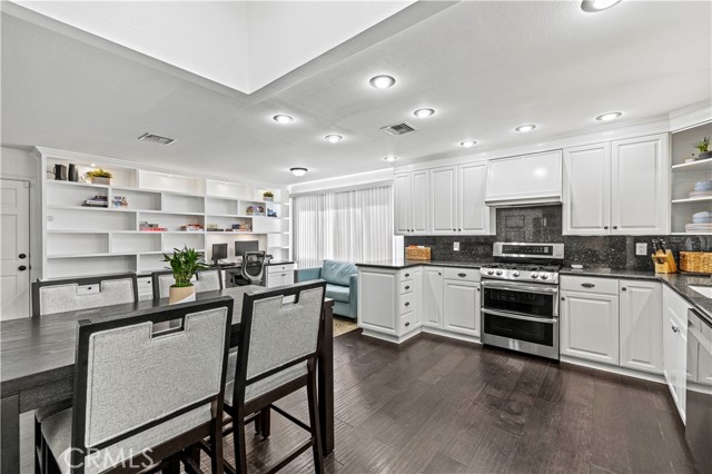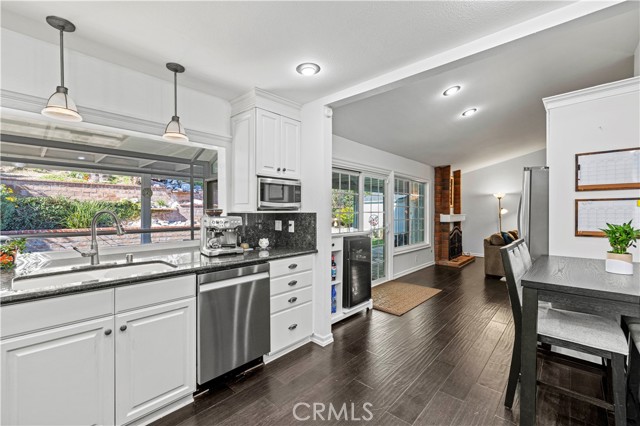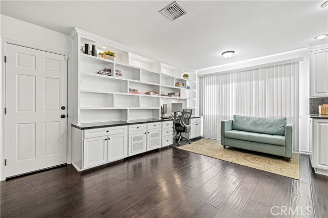 Inside, you’ll find wood flooring and an open layout that creates a comfortable flow between the kitchen and family room. Dual-pane windows and a whole-house fan enhance energy efficiency and everyday comfort. The kitchen offers white cabinetry, granite countertops, stainless steel appliances, recessed lighting, and added built-ins in the office area for extra storage and functionality. It opens directly to the living spaces, making it practical for daily living and gatherings alike.