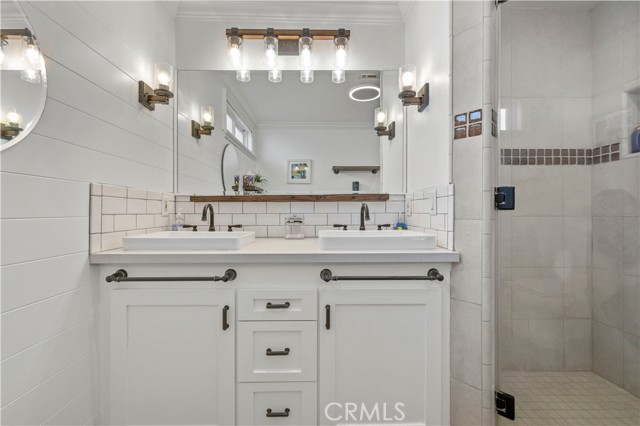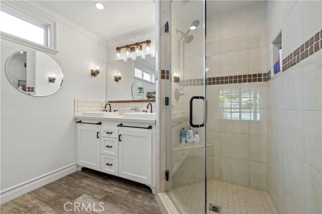 The primary suite includes custom built-ins in the closet and a remodeled ensuite bathroom with a large shower, quartz countertops, and subway tile backsplash. Three additional well-sized bedrooms share a remodeled hall bathroom.