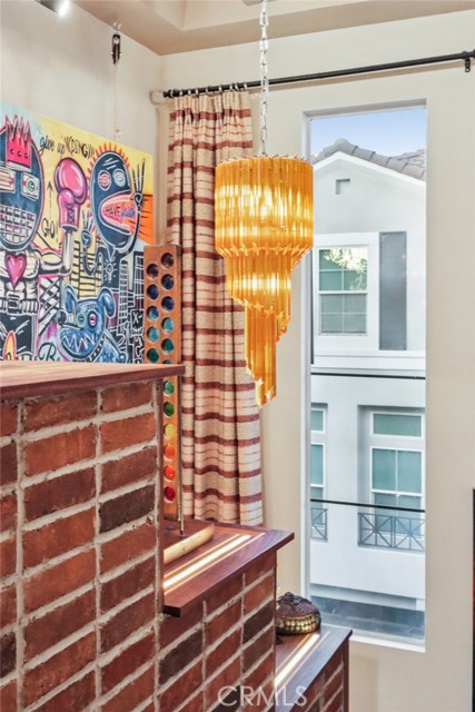 The loft showcases an industrial-artistic ceiling with exposed rebar and rope, while the second-floor staircase is enhanced by a soffitted ceiling, vintage lighting, and charming brick veneer walls—creating a warm and dramatic architectural focal point. Additional upgrades include remodeled bathrooms, a new primary shower with porcelain and Trex wood finishes, a newer A/C unit, all-new doors with opaque glass, and a custom-designed garage featuring a tin roof, African mahogany storage cabinetry, and track lighting.