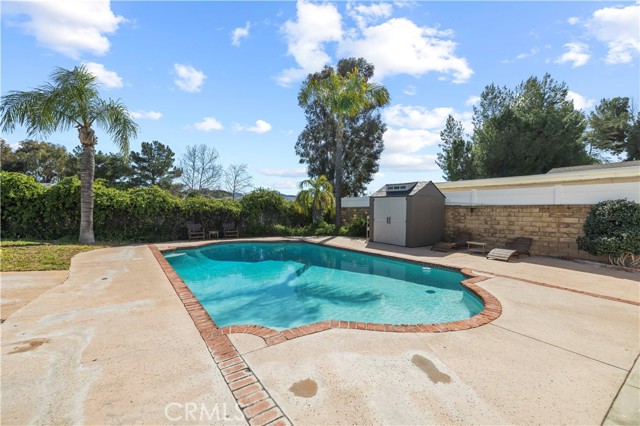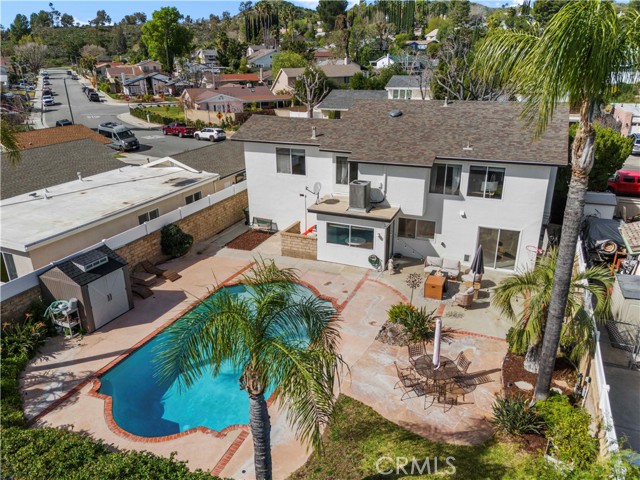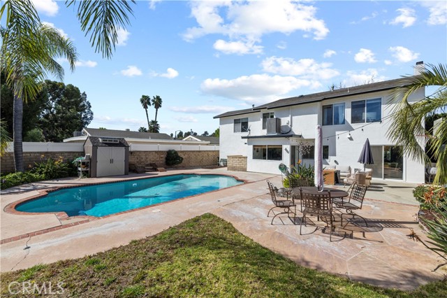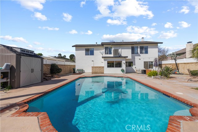 Uptairs, four generous bedrooms provide flexible living — one can easily be divided into a fifth bedroom or a home office. The master bathroom is nicely updated with travertine finishes, dual sinks, and dual shower heads, plus a walk-in closet. Practical updates within the last five years include a fully replaced roof in 2021, updated pool equipment, and a recently added tankless water heater; the home also features central A/C and heating, with a newer HVAC condenser. Bonus storage above the garage plus extra outdoor storage!