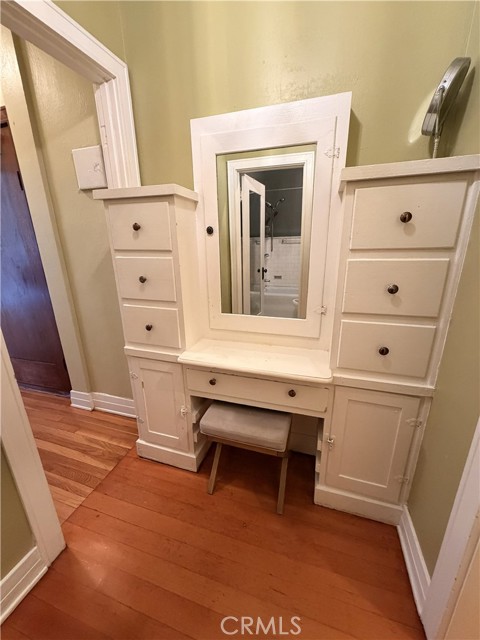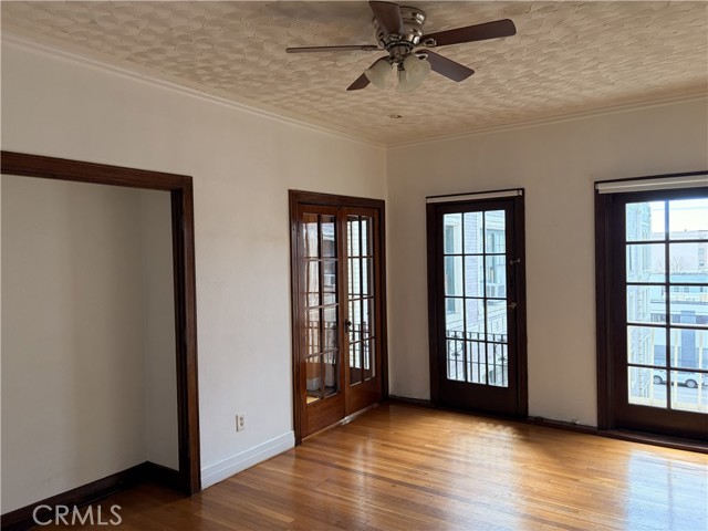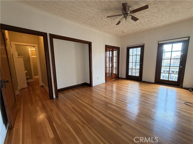 Welcome to this beautifully remodeled studio located on the top floor of a classic historic building, blending vintage charm with modern comfort. The unit features soaring 9-foot ceilings, an open floor plan, original hardwood floors and doors, crown moldings, an Art Deco ceiling, and a separate vanity area. A generously sized closet provides ample storage. The private kitchen offers ample cabinetry, hanging shelves, and a cozy eating area. Enjoy a pleasant view of the courtyard from the living space. The bathroom includes a relaxing soaking tub.