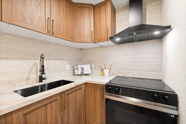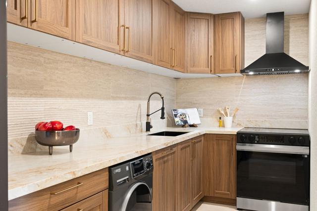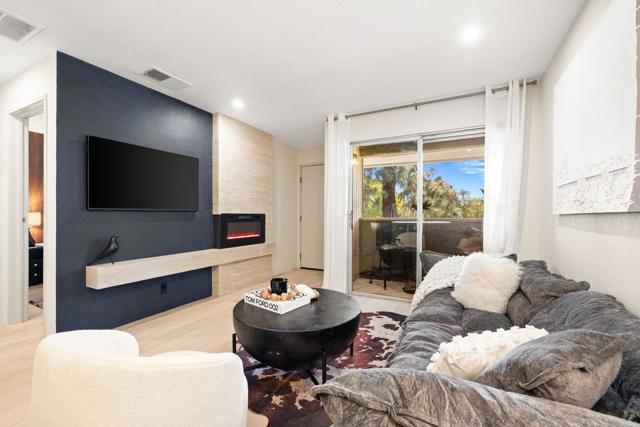 Designer-Furnished Palm Springs Retreat with Resort Amenities & Mountain Backdrop. Fully remodeled and offered furnished, this beautifully reimagined residence blends warm modern design with elevated desert style. Thoughtfully curated by a local designer, the home showcases custom wood accent walls, wide-plank flooring, statement lighting, and refined finishes throughout.The open living space feels both sophisticated and inviting, anchored by a dramatic fireplace feature wall and layered lighting. The kitchen is sleek and functional with quartz countertops, custom cabinetry, black stainless appliances, and a rare built-in all-in-one washer/dryer, a standout upgrade in this community. The bedroom is a true retreat, featuring a statement canopy bed, designer chandelier, custom accent wall, and serene treetop views. Enjoy resort-style living with multiple pools and spas, tennis courts, beautifully landscaped park-like grounds, and dramatic San Jacinto mountain views throughout the community. Fee land, you own the land. Offered fully furnished and move-in ready, this is an ideal full-time residence, weekend escape, or investment opportunity in the heart of Palm Springs.