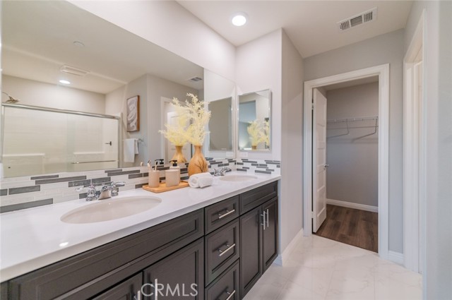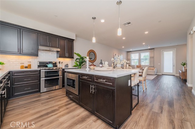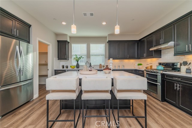 Former model home with tons of upgrades! This beautiful townhouse has 3 bedrooms, 3.5 bathrooms, 2-car attached garage. First floor features a private bedroom with its own full bathroom ideal for guests, in-laws, or could be a home office. Second floor offers a bright and open main living area filled with natural light. Spacious living room with a balcony where you can enjoy the mountain and city lights views. Upgraded kitchen with recessed panel maple cabinets, quartz counter tops, full backsplash, Whirlpool stainless-steel appliances including counter depth refrigerator, built-in microwave, creating a comfortable open layout for daily living and entertaining. Two additional bedrooms are located on the third floor, providing privacy and functional separation. Primary bedroom with walk-in closet. Primary bathroom with dual sinks. Other notable features include: designer selected paint, custom window curtains and window blinds new LVP flooring throughout, new garage door and springs, EV charger port, and epoxy floor, and new tankless water heater. Well maintained Jade Tree community with playground, park, and BBQ area. Low property tax. Prime Chino Hills location close to shopping, dining, parks, and commuter access, walking distance to Chino Hills High, zoned to Wickman Elementary. Well-suited for both primary residence and long-term investment.