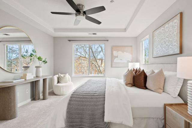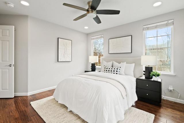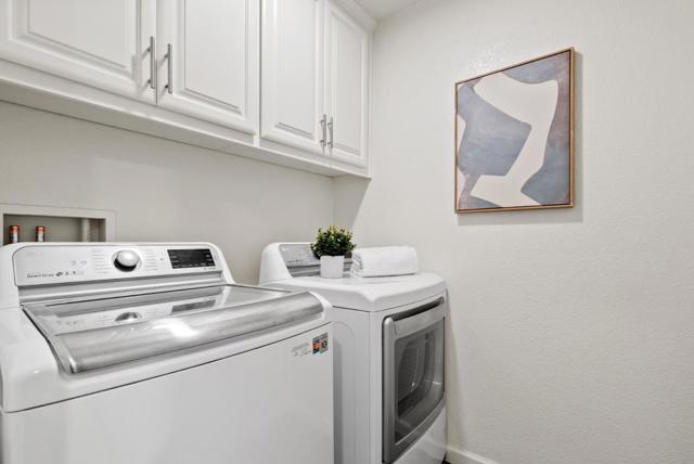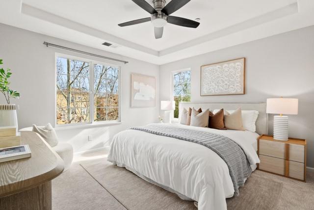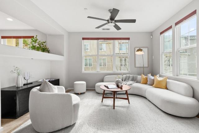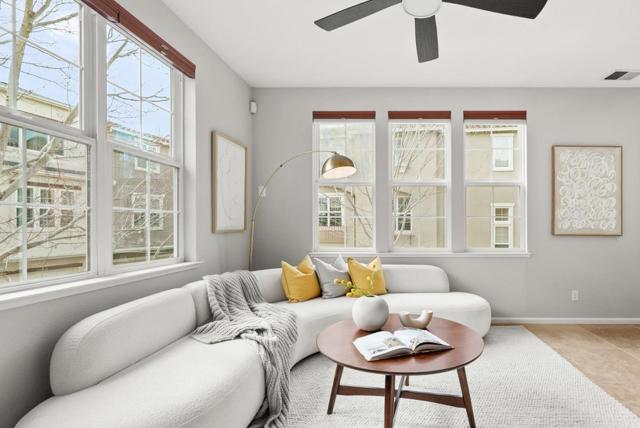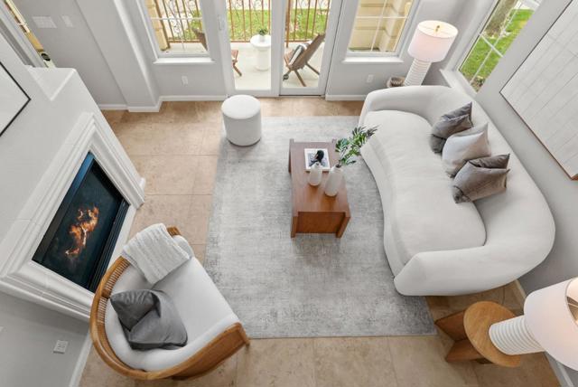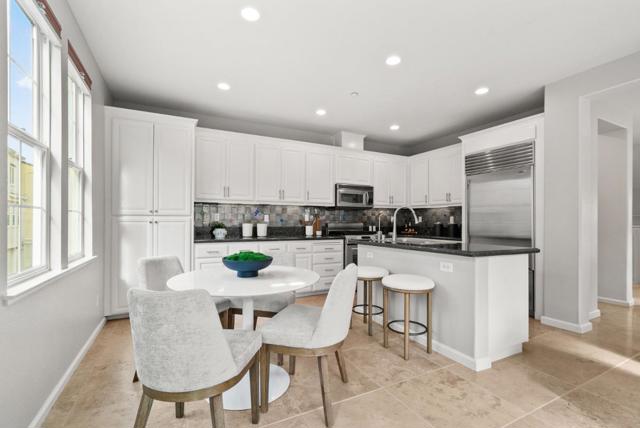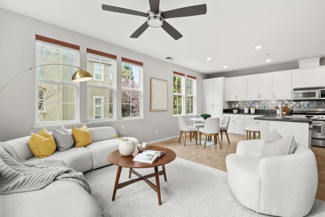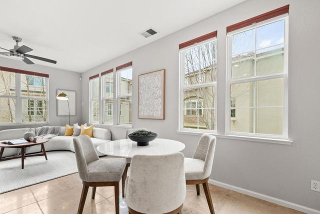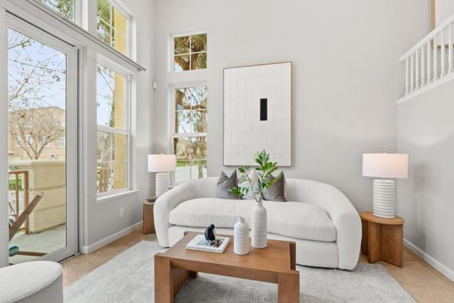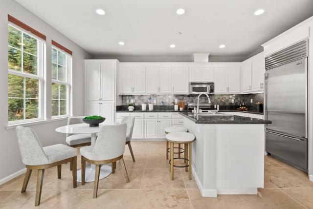 Bright end-unit townhome offering Rivermarks largest layout, thoughtfully upgraded and filled with natural light. The open main level features soaring vaulted ceilings, a cozy fireplace, and elegant large travertine stone tile flooring, creating a welcoming and refined living space. A formal dining area overlooks the living room and is framed by large windows with serene greenbelt views, bringing in beautiful natural light and an inviting indoor-outdoor connection. The gourmet kitchen opens seamlessly to the family room and features a spacious center island with sink, white cabinetry, granite countertops with full tile backsplash, and stainless steel appliances, including a Sub-Zero refrigerator. A charming breakfast nook overlooks a greenbelt with beautiful cherry blossom trees, offering a peaceful spot to enjoy morning coffee or casual meals. Upstairs, hardwood floors add warmth throughout. Additional highlights include a two-car garage with a crawl space for generous storage. Enjoy walking distance to the community pool, park, Rivermark Plaza and just one block to Don Callejon School. Only minutes to major tech campuses like Intel, Cisco, and NVIDIA. A well-appointed home offering space, comfort, and the lifestyle Rivermark is known for.