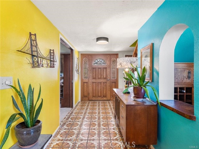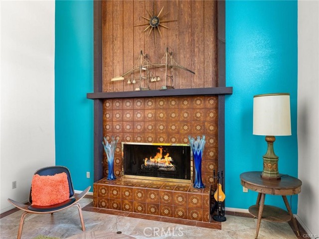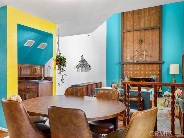 The sunken family room is warm and inviting, highlighted by newer tile flooring, a fireplace, vaulted wood-beamed ceilings, and a built-in wine bar. Large windows frame peaceful views of the pool and golf course, filling the space with natural light and creating an ideal gathering place.