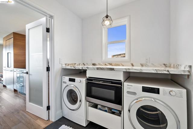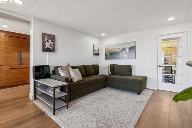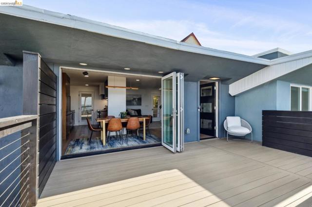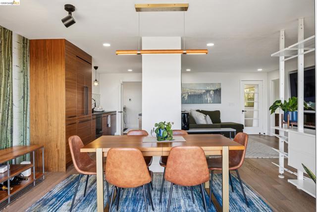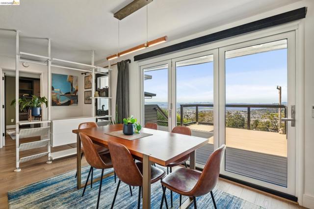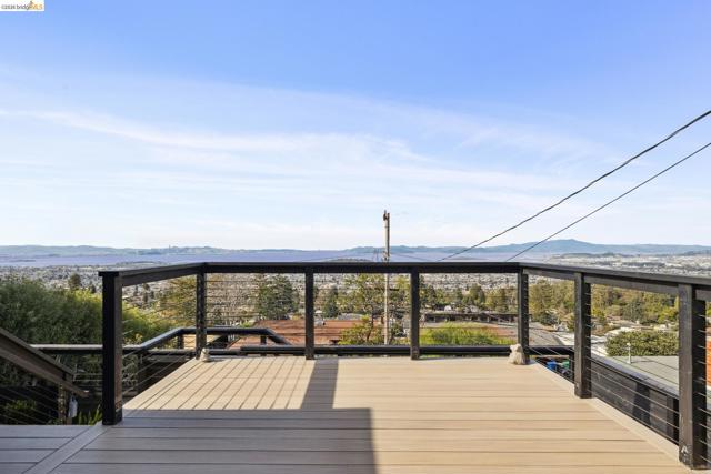 Mid-century modern home with breathtaking views of the Bay Bridge, Golden Gate Bridge, San Francisco skyline, and Mt. Tamalpais. An open floor plan captures the views from the kitchen, dining, and living areas, creating a natural flow for both everyday living and entertaining, with seamless access to an expansive deck for indoor-outdoor living. Thoughtfully updated throughout, the home features a modern kitchen, two full bathrooms, a bright laundry room, and a flexible office space. Each bedroom features its own updated en-suite bath. Recent improvements include newer windows, updated electrical, EV charger installation, a newer deck, added wall insulation, and upgraded plumbing. Approximately 0.3 miles to shops and amenities in Kensington Village.