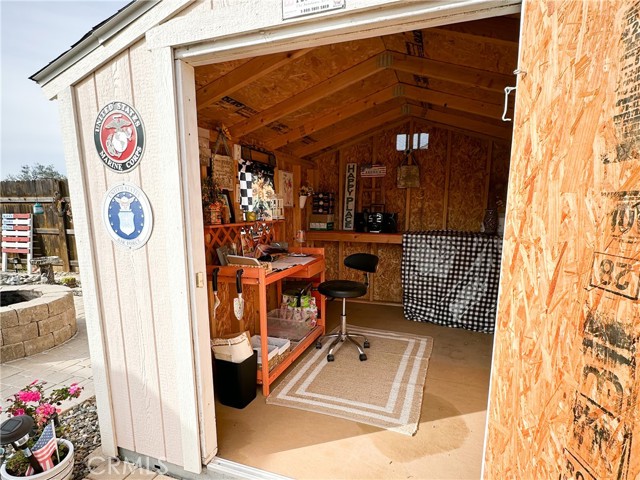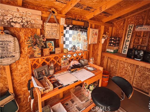 The beautifully landscaped backyard features a river rock garden with mature plantings and citrus, along with two detached structures: a charming she shed retreat and a separate storage building with a garage-style door—ideal for hobbies, storage, or workspace.