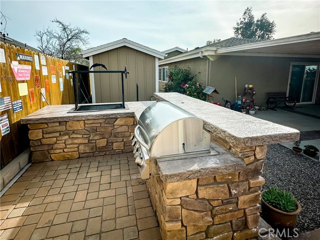A second living space at the center of the home features a built-in dry bar and additional entertaining space, with a slider that opens to the covered patio. With the area’s year- round enjoyable climate, the home is well-suited for effortless indoor-outdoor living. The spacious covered patio, built-in outdoor kitchen and barbecue, and multiple gathering areas create an ideal setting for hosting and relaxing.