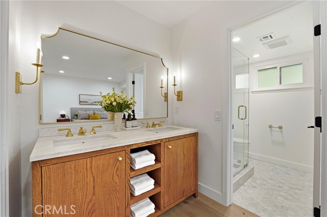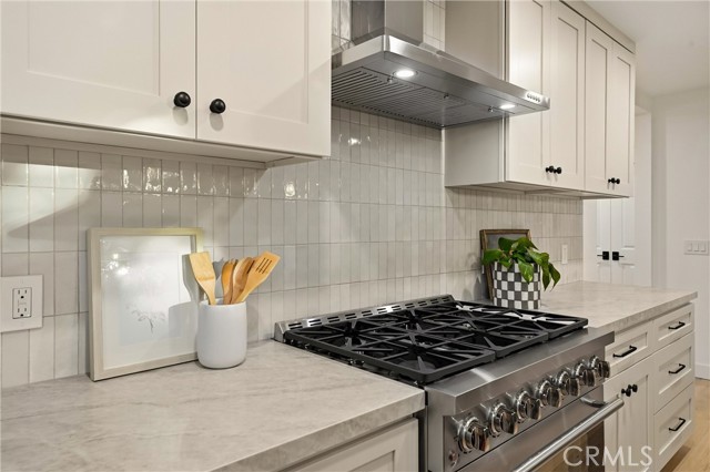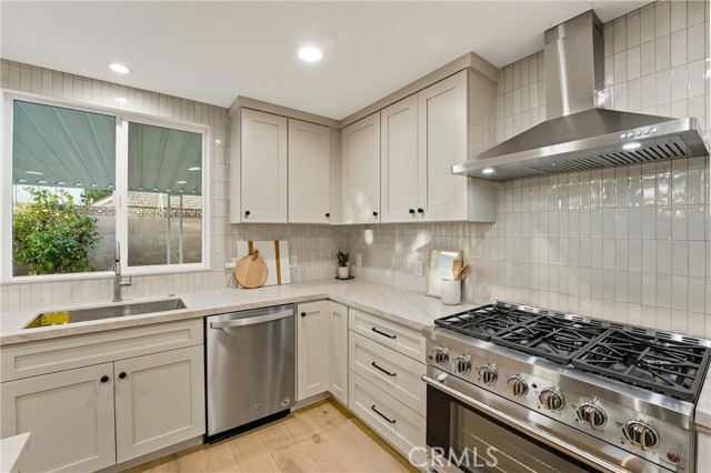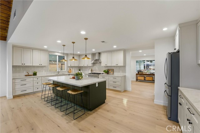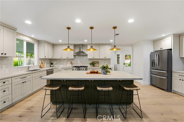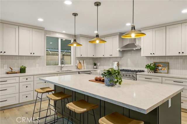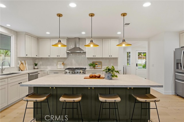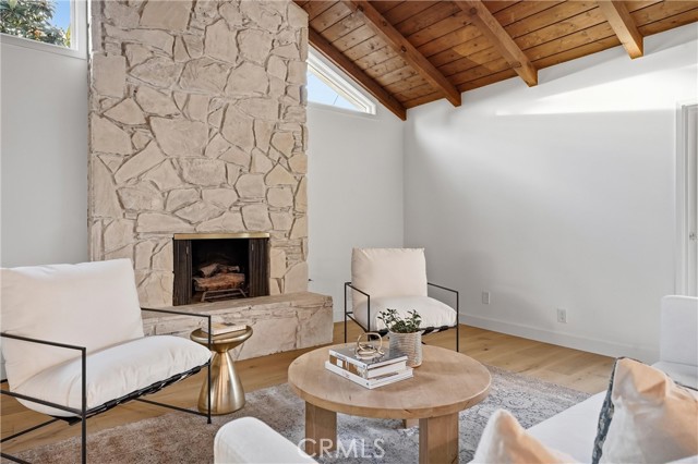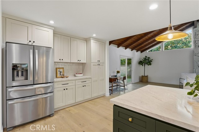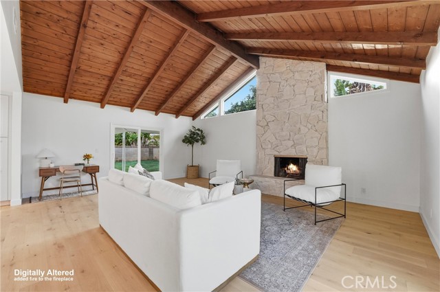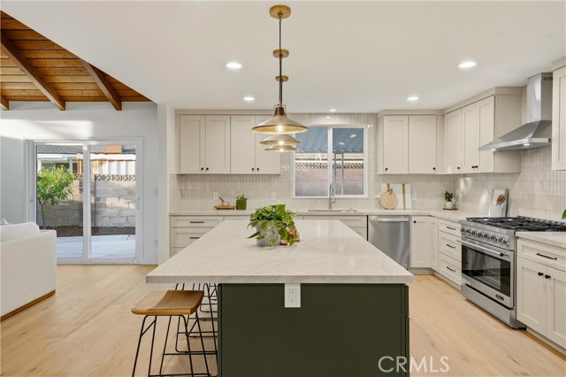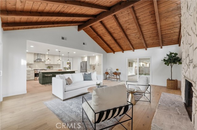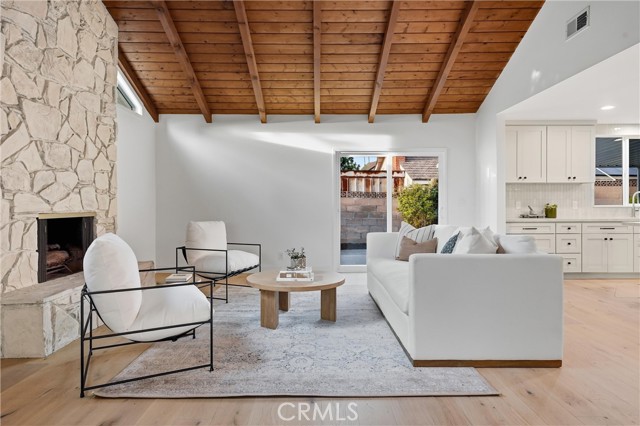 Completely re-imagined, an exceptional turnkey residence on a beautiful quiet tree lined street in one of Orange’s most sought after neighborhoods. From the moment you enter wide-plank engineered hardwood floors create an immediate sense of warmth and sophistication guiding you through a home thoughtfully designed for elevated entertaining and effortless daily living.The living room makes a striking impression, anchored by a dramatic stone fireplace and framed by the dark-stained tongue-and-groove wood plank ceiling—an architectural feature that blends timeless character with modern elegance. The open-concept layout flows seamlessly into a chef-caliber kitchen that rivals custom luxury builds. Professional grade appliances including a 36” six-burner gas range, built-in microwave drawer, integrated dishwasher and refrigerator—are paired with a commanding oversized island designed for gathering. Custom cabinetry in designer-selected hues complements stunning Taj Mahal quartz countertops, creating a space that feels straight out of a high-end design magazine. Statement lighting from Visual Comfort, Studio McGee, and exclusive Pure Salt Interiors selections add a layer of curated sophistication rarely found in this price range. The guest bath showcases Bedrosians porcelain tile, while the spa-inspired primary suite is wrapped in floor-to-ceiling marble. A Rejuvenation oak vanity crowned with marble and accented by Kingston Brass fixtures completes the retreat with effortless, designer-level refinement. Beyond aesthetics, the home offers enduring quality and meaningful upgrades: dual-pane windows and sliding doors, a newly installed roof with a 50-year material warranty and 25-year labor warranty, a newer HVAC system, and a recently replaced water heater. The epoxy-finished two-car garage delivers a sleek, gallery-like presentation and includes a dedicated laundry space with washer and dryer. With convenient access to the 91 and 55 freeways and proximity to highly regarded schools, the location offers both prestige and practicality. Homes with this caliber of finishes, architectural charm, and thoughtful renovation are typically reserved for significantly higher price points—making this a rare opportunity to own a truly designer-curated residence without the designer-level premium.This is more than a home. It's elevated living,exceptional craftsmanship,and luxury redefined offered at a value that is nearly impossible to replicate.