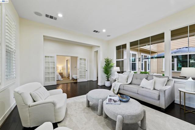 Experience refined living in this one-of-a-kind former model home located in the prestigious Private Reserve. From the moment you arrive, mature trees and a beautifully tiered walkway set the tone for the elegance within. As you walk inside the NORTH facing front door you are greeted with soaring 10-foot ceilings, gleaming hardwood floors, and designer lighting create a stunning first impression. The desirable floor plan includes a MAIN LEVEL BEDROOM AND FULL BATH, formal dining with custom built-in buffet, and an expansive great room anchored by a gas fireplace. The chefs kitchen is luxuriously appointed with WOLF TRIPLE OVENS, a WOLF 6-burner range+griddle, SUB-ZERO REFRIGERATOR, wine refrigerator, and a striking leathered granite island. Upstairs features a spacious loft/optional 5th bed with built-in media cabinet and custom integrated refrigerated drawers. A private sauna room/bedroom, upstairs laundry with sink & storage, and a luxurious primary suite with sitting area and fireplace. Outdoor living shines with a serene central courtyard and a private backyard with brick patio and dramatic water feature. Don’t miss this opportunity to own this home!