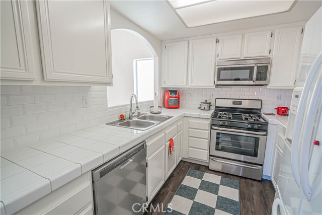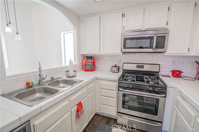 The kitchen showcases white tile countertops and backsplash, along with abundant wood cabinetry for ample storage. The primary suite includes a walk-in closet and private en-suite full bath. The secondary bedroom features mirrored closet doors and convenient access to a full hall bathroom.