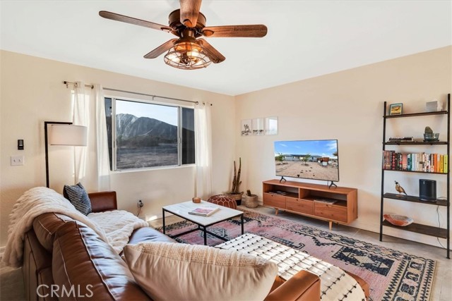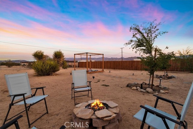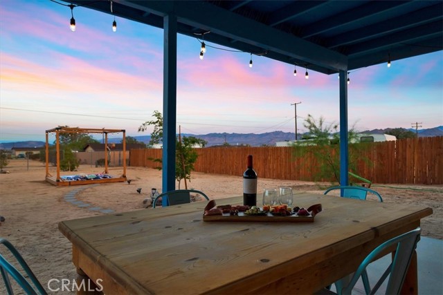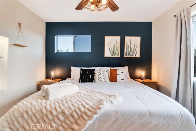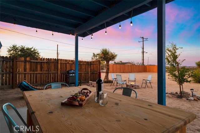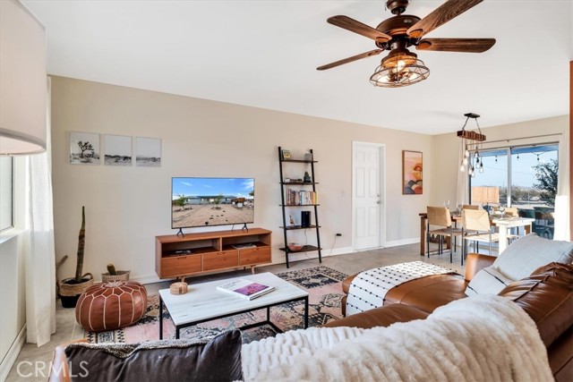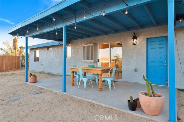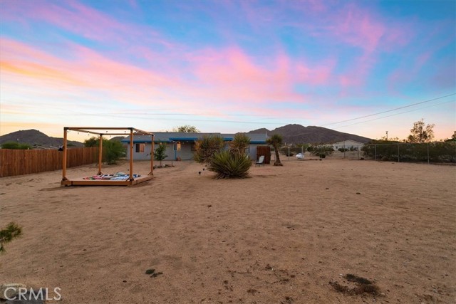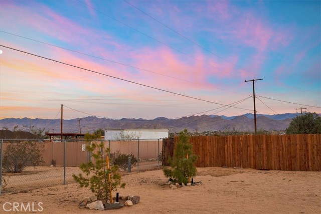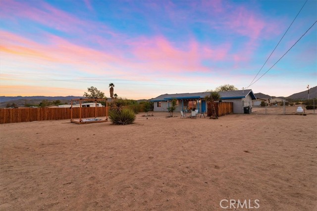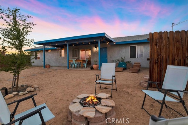 Located in the Hidden Rivers area of Joshua Tree, this inviting 2 bedroom, 1 bath home sits on just under half an acre and offers comfort, light-filled living, and a thoughtfully designed outdoor space. The spacious main living area features tile flooring, a ceiling fan, sliding glass doors, and plenty of natural light, creating an open and welcoming atmosphere. The kitchen provides ample cabinet and counter space, making meal prep easy and functional. Both bedrooms are generously sized and well lit, each with its own ceiling fan for added comfort. The bathroom includes a classic tub/shower combo. Step outside to a fenced backyard that’s ready for relaxing or entertaining. A covered back patio offers shaded seating, while chain link and privacy fencing create a secure environment. The yard also features a fire pit, a sunbathing platform, and plenty of open space to enjoy the desert lifestyle. All this, plus it's only minutes from all the amenities of Joshua Tree Village and the entrance to the national park? Wow! With its convenient Hidden Rivers location and comfortable layout, this home is a great opportunity to experience Joshua Tree living.