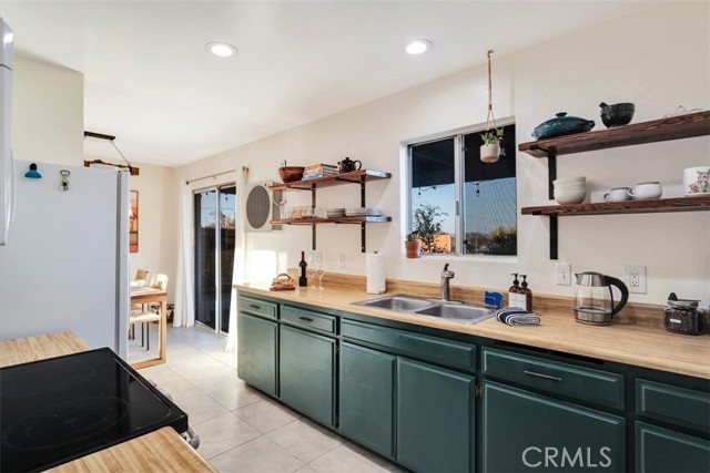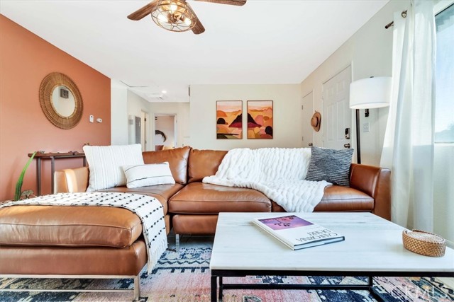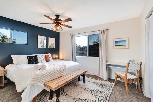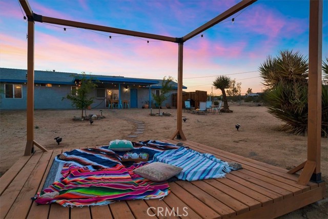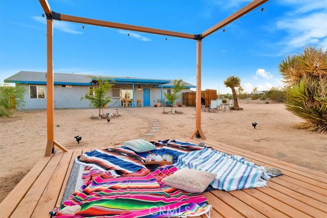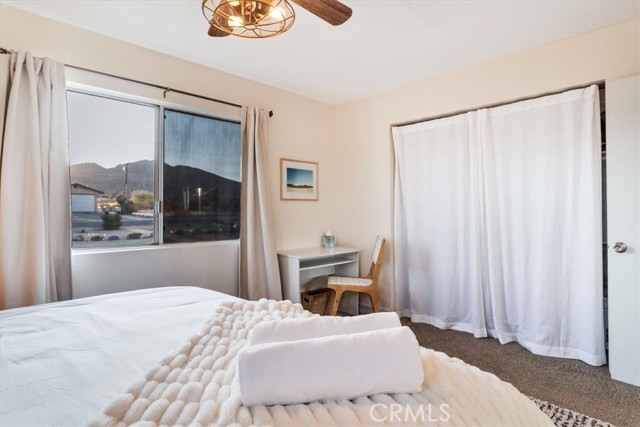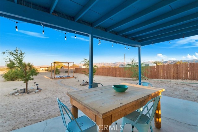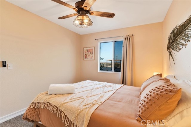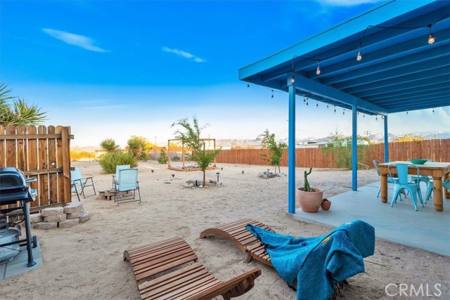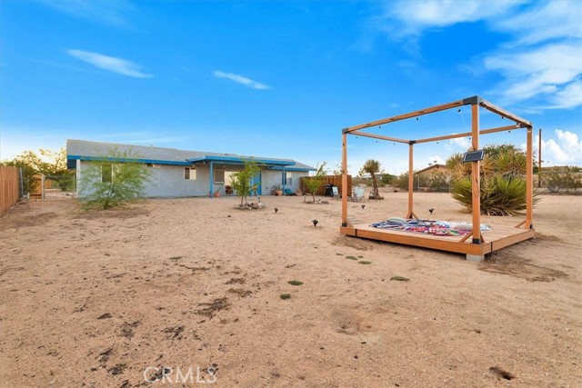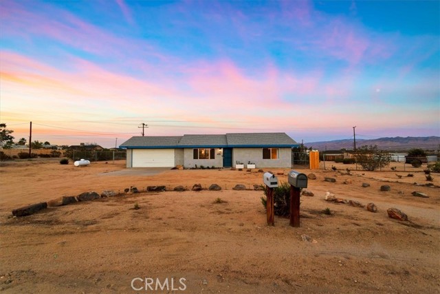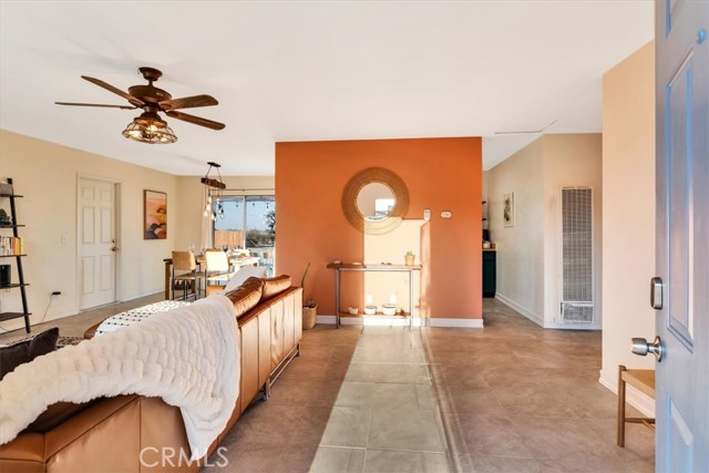 Located in the Hidden Rivers area of Joshua Tree, this inviting 2 bedroom, 1 bath home sits on just under half an acre and offers comfort, light-filled living, and a thoughtfully designed outdoor space. The spacious main living area features tile flooring, a ceiling fan, sliding glass doors, and plenty of natural light, creating an open and welcoming atmosphere. The kitchen provides ample cabinet and counter space, making meal prep easy and functional. Both bedrooms are generously sized and well lit, each with its own ceiling fan for added comfort. The bathroom includes a classic tub/shower combo. Step outside to a fenced backyard that’s ready for relaxing or entertaining. A covered back patio offers shaded seating, while chain link and privacy fencing create a secure environment. The yard also features a fire pit, a sunbathing platform, and plenty of open space to enjoy the desert lifestyle. All this, plus it's only minutes from all the amenities of Joshua Tree Village and the entrance to the national park? Wow! With its convenient Hidden Rivers location and comfortable layout, this home is a great opportunity to experience Joshua Tree living.