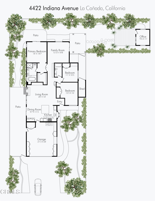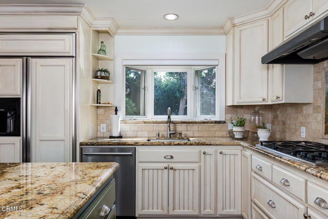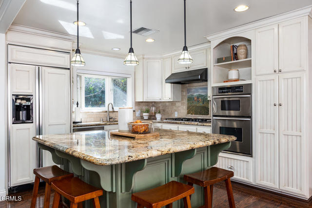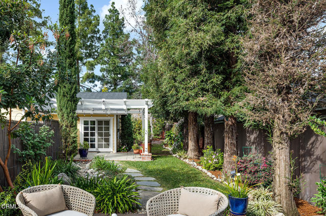 Rare opportunity in La Canada Flintridge! This remodeled three bedroom, two bathroom single story home rests at the end of a convenient cul-de-sac near Descanso Gardens. Expanded and enhanced in 2005, the home features a modern open kitchen with a generous entertainer's island, granite countertops and travertine backsplash. The living and dining areas feature custom built-ins, a gas travertine fireplace and French sliding doors open to a serene side patio. Finishes include custom cabinetry, built-in hutch, distressed wide-plank wood floors and brass/polished nickel hardware. The primary suite offers vaulted ceilings, oversized closet, a relaxing bathroom and sliding doors to the inviting backyard garden. The two additional bedrooms are generously sized and adjacent to the beautifully updated full bathroom. The family room features vaulted ceilings and sliding doors to the patio for extended indoor/outdoor California living. The backyard is a private oasis featuring a 12x10 stand-alone office studio with HVAC, a Trek composite deck, a new gazebo with party lighting, a garden shed and lush landscaping surrounding the home. The fully finished 2-car garage is a showstopper with epoxy floors, an abundance of storage, granite-topped folding counters and a laundry station. Additional amenities include fiber cement siding, a Honda whole-house generator, a tankless water heater and attic storage. Professional landscaping with artificial turf ensures effortless curb appeal. Enjoy proximity to award-winning schools, Memorial Park, Farmer's Market, shops and restaurants, with easy access to Verdugo Hills Hospital and freeways. Don't miss this amazing turnkey lifestyle in a premier location!