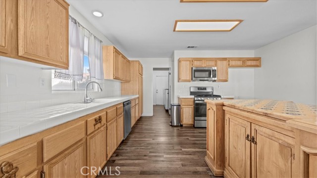 Step inside to find a warm and inviting living space highlighted by a cozy fireplace with a custom mantel and included entertainment equipment. The kitchen is a true centerpiece, featuring a stunning Spanish-accent tiled island, ample storage, and appliances that are just two years new — including the dishwasher, stove, microwave.