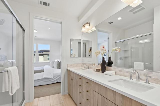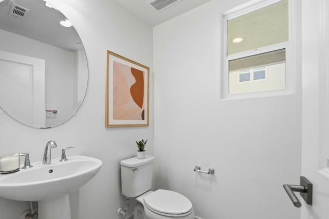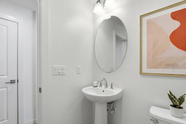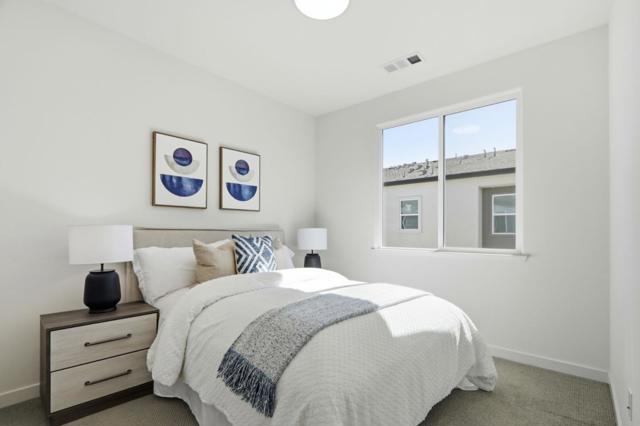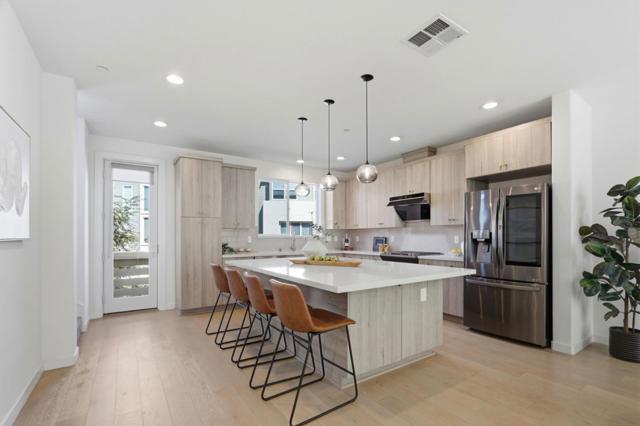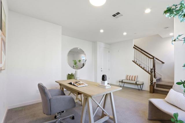 Built in 2020 by luxury builder Toll Brothers, this immaculate 3-Bedroom + Office townhome in Milpitas coveted Parkside community enjoys a premium front-facing setting overlooking the community garden and is just steps from Tango Park, a new city park. A versatile ground-level den is ideal for a home office, gym, or guest space. The bright, open main level features a spacious living room, private patio, and a chefs kitchen with quartz countertops, a large island, full-tile backsplash, upgraded cabinetry, pantry, and a generous dining area. Upstairs, the serene primary suite offers a walk-in closet, dual vanities, and a walk-in shower, complemented by two additional bedrooms. Thoughtful upgrades include dual-zone A/C, double-pane windows, water softener, RO drinking water system, designer pendant lighting, and a side-by-side 2-car garage with EV-ready outlet and epoxy flooring. HOA dues include water and garbage, and provide a solar credit benefit to help offset electricity costs. Ideally located near the Great Mall, BART, Costco, Trader Joes, and top-rated schools including 10/10 Northwood Elementary and award-winning Morrill Middle with no rental restrictions.