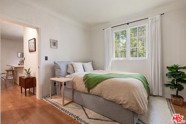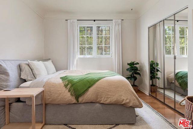 Welcome to Unit 1 at Hayworth Gardens - a private, secure sanctuary within a romantic 1929 Spanish hacienda built around a stunning central courtyard. Tucked along a beautiful tree-lined side street and just moments from Bristol Farms, Whole Foods, and an array of popular restaurants, this remodeled condominium offers the perfect blend of historic character and modern sophistication. From the moment you enter the building foyer, you're greeted by exquisite period tile work and a picturesque view of the central courtyard - a nod to the glamour and architectural romance of late 1920s Hollywood. Inside, the residence has been thoughtfully reimagined using high-quality materials while preserving its original Spanish charm. A wall of windows fills the open-concept living space with natural light, creating a warm and inviting atmosphere. The spacious living room flows seamlessly into the dining area and adjacent galley kitchen, offering both functionality and effortless entertaining. The kitchen is beautifully appointed with quartzite countertops, bespoke cabinetry, oil-rubbed bronze hardware and custom details, a five-burner stove, and stainless steel appliances by Bosch and GE. Wood floors run throughout the home, complementing fresh paint and refined finishes. A complete electrical rewire enhances both safety and modern convenience. The bedroom is thoughtfully positioned for privacy and connects to a spacious bathroom, creating a peaceful retreat separate from the main living areas. Located one level below the lobby, Unit 1 enjoys a private, standalone-home feel. An assigned gated parking space and a separate storage unit add everyday ease. Low HOA dues cover all utilities, providing exceptional value. Unit 1 offers a rare opportunity to own a home of timeless elegance, modern upgrades, and an unbeatable value for the location.