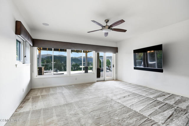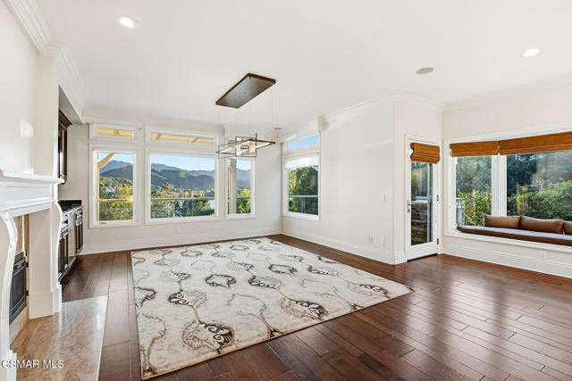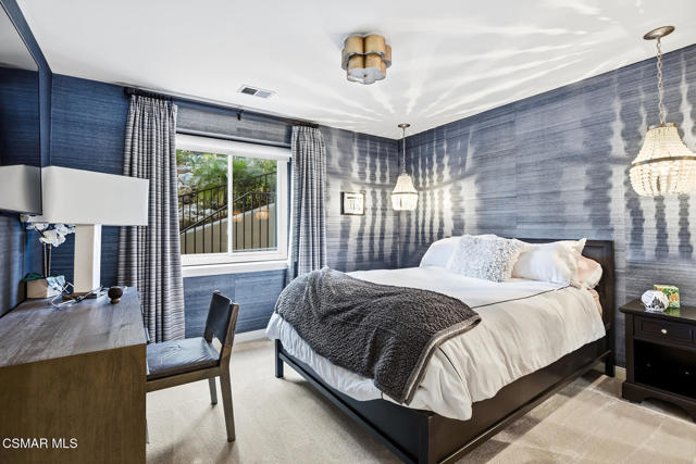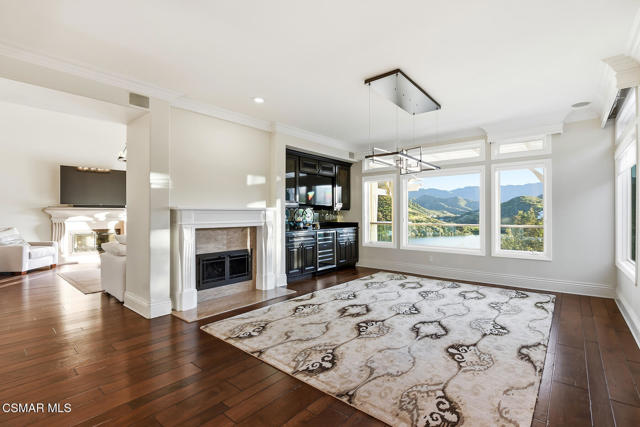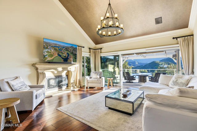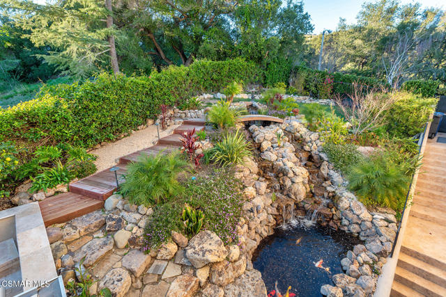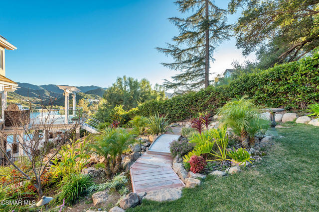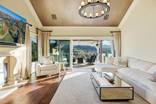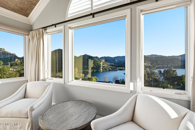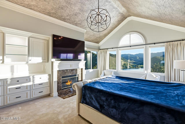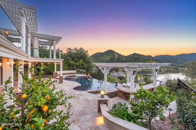 Extraordinary view estate in the exclusive gated community, North Shore of Lake Sherwood. Jaw dropping panoramic lake and mountain views from everywhere! Features of this tri level traditional include 4 bedrooms, 3.5 baths, designated office and more. The upper level provides a large loft/gym and a sensational primary with cathedral ceilings, fireplace and panoramic views! The main level is the heart of the house with a center island kitchen, formal dining room w/fireplace, office/library and a wonderful family room that opens to a large covered deck and some of the best views Thousand Oaks has to offer. On the lower level there are three bedrooms and two baths. One of the bedrooms is currently used as a bonus/game room. The grounds are second to none! The infinity pool is flanked with fire bowls and enjoys a swim up bar to the sunken outdoor kitchen! There is also a large covered patio with heaters, waterfall koi pond and an abundance of patio space to enjoy the dramatic views from every angle! An absolute show stopper!