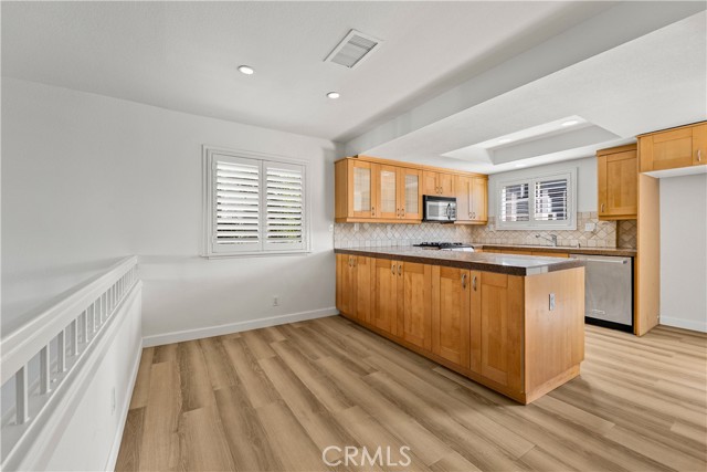 Discover your serene retreat in this beautifully updated, stylish 2-bedroom end-unit townhouse, perfectly nestled in the heart of highly desirable Laguna Niguel. Flooded with natural light, this home features soaring vaulted ceilings and picturesque views of mature trees and scenic walking trails, creating a peaceful, private ambience. The unique open-concept floor plan flows effortlessly, highlighting a cozy fireplace in the inviting living area and a chic, modern kitchen ideal for the avid culinary enthusiast. Kitchen impresses with stainless steel appliances, striking stone countertops and a tumbled travertine backsplash, all complemented by elegant shaker-style maple cabinets for a warm, upscale feel. Enjoy sunlit mornings in the charming eat-in dining nook with a bay window that frames tranquil outdoor views. This home offers two generous master suites, each with its own private full bathroom, providing exceptional comfort, flexibility and privacy for guests or roommates. Additional highlights include a convenient indoor laundry room, fresh paint throughout, new wood-lux vinyl flooring and baseboards, plush carpet, newer AC and furnace, water softener for enhanced everyday comfort and attached two-car garage with direct access. Ideally located near Laguna Niguel Lake, Crown Valley Community Park and the lush Laguna Niguel Botanical Gardens. This townhouse offers effortless access to scenic walking and biking trails, nearby shopping and dining. The coastal charm of Laguna Beach and Dana Point are a short drive to 5 star dining, shops and entertainment including fun year-round special events, Dana Point Harbor boat tours, pristine beaches and 5-star resorts: Ritz Carlton, Waldorf Astoria with the Monarch Links world-class golf course. This home offers a lifestyle of unparalleled luxury with a casual, relaxing vibe. Welcome home to 24839 Nueva Vista!