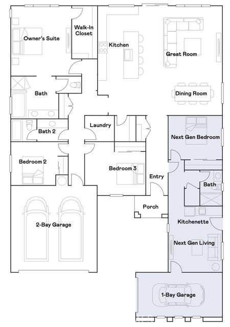 NEW CONSTRUCTION! Ready for Immediate Move-in! This new single level Next Gen® home is ready for modern lifestyles and features a private suite with a separate entrance, living area, kitchenette, bedroom and bathroom for seamless independent living. At the back of the home is an open-concept floorplan shared between the kitchen, living and dining areas. Three additional bedrooms are tucked away to the side, including the lavish owner’s suite with a private bathroom and walk-in closet. Includes a three car garage.