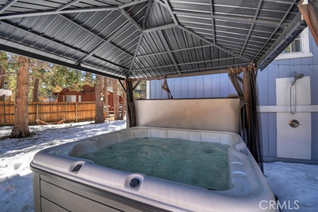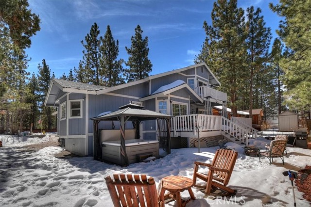 features include a large deck, tile patio, an outside spa with a gazebo, and a spacious storage shed, all