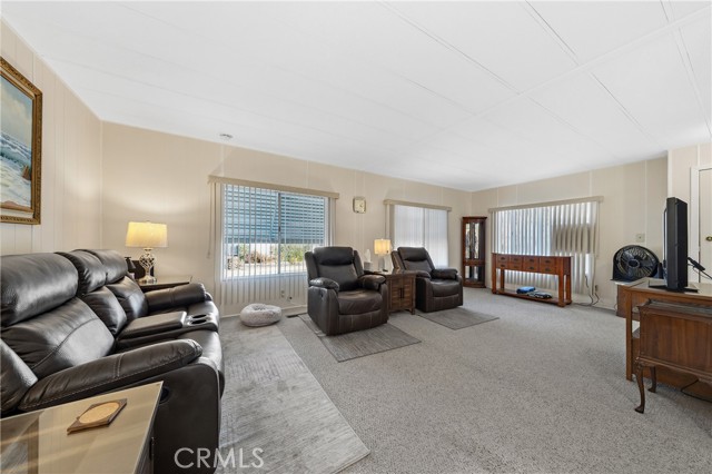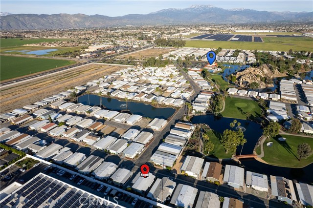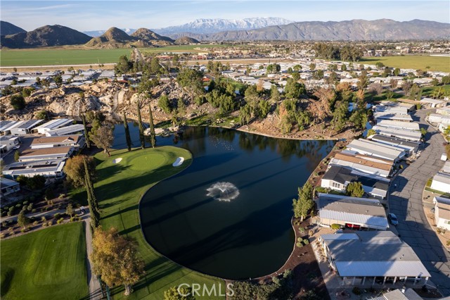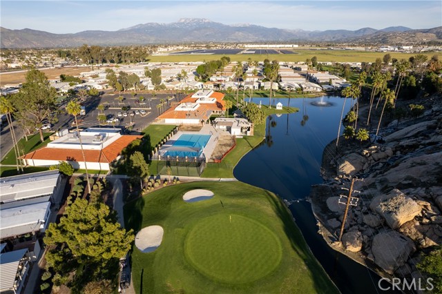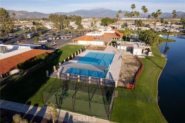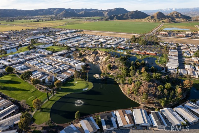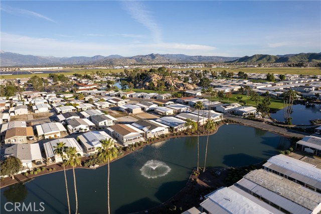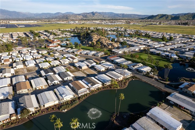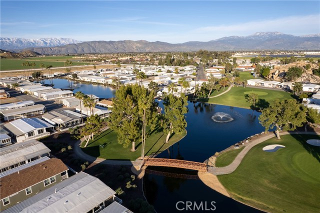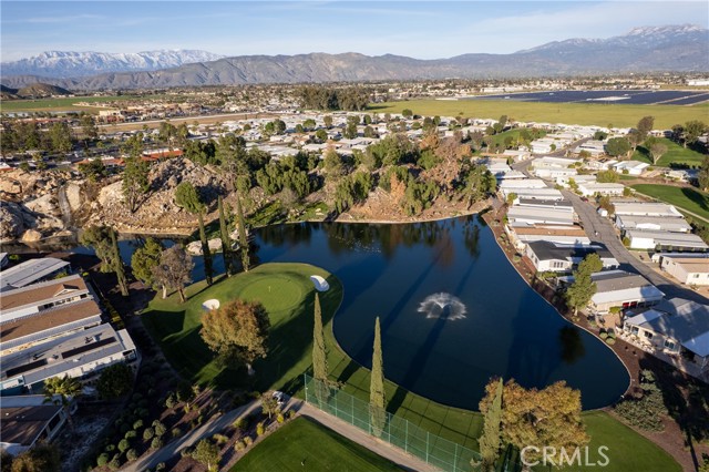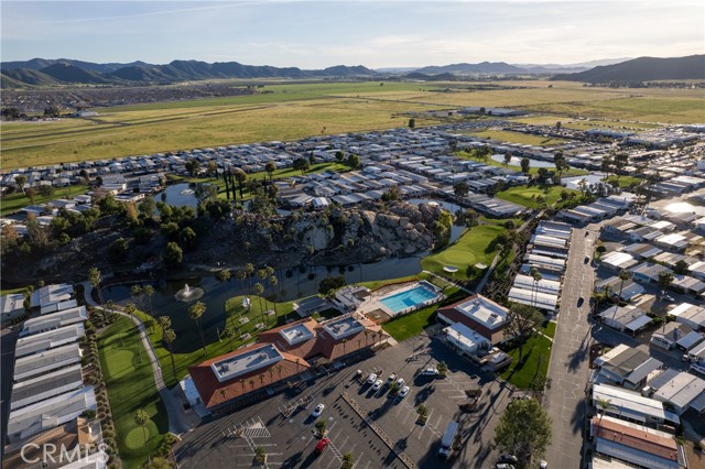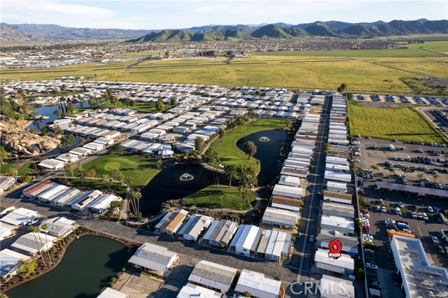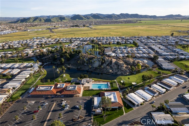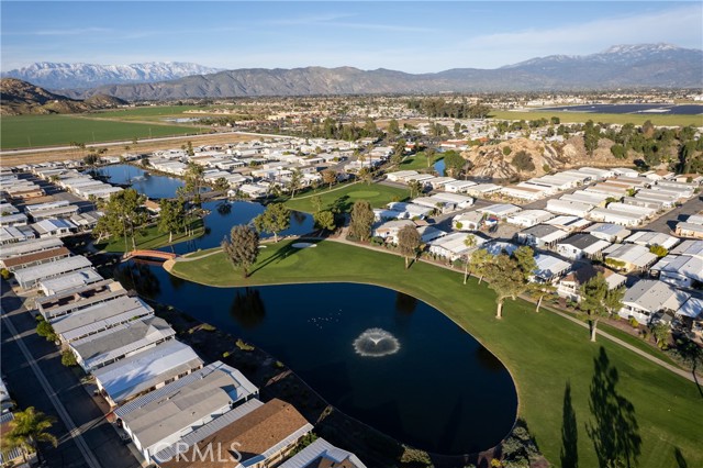 Well-maintained 2 bedroom 2 bath located in scenic The Lakes at Hemet West senior 55+ mobile home park. Formal living/dining combo with low-pile Berber carpet, ceiling fan, and built-in buffet hutch. Galley kitchen has gas cooktop, dishwasher, refrigerator, breakfast bar, and newer gas oven/boiler. Cozy family room with access to raised covered front porch. Master has ceiling fan, two closets, and dual-sink vanity with oversized stall shower. Inside laundry shelving, washer and dryer included. Guest bedroom as en suite full bath also accessible from main living area. Both HVAC and energy-saving evaporative cooling unit. Security screen doors. Roof resealed approximately 3 years ago and home was recently re-leveled. Extra tall carport accommodates higher-rise vehicles. Handicap accessible ramp. Easy-care rockscaping. Bearing fruit trees including navel oranges, loquat, and "cherry" guava. Park amenities include 9-hole par 3 Golf Course, heated pool and spa, indoor shuttleboard court, catch-and-release fishing, pickleball court, bocce ball, horseshoes, picnic area, playground, dog park, and community garden. Clubhouse and banquet room with kitchen facilities, billiard tables, fitness center, ceramics room, library/reading room, and community laundry. Hosted events. Monitored gate access. One of the nicest parks in the valley.