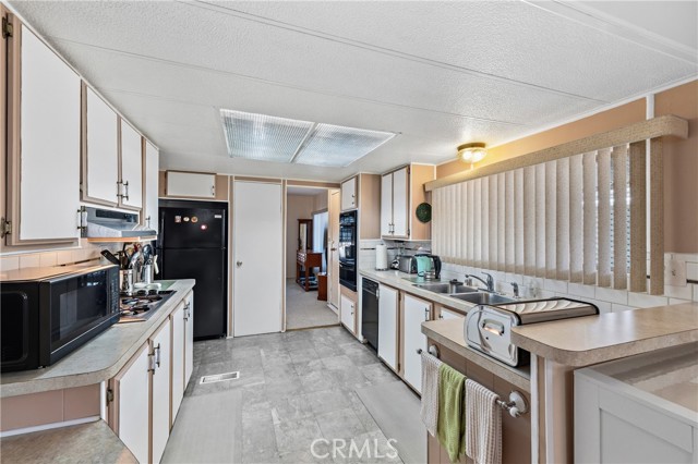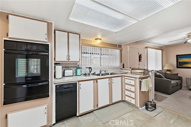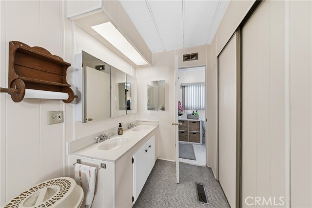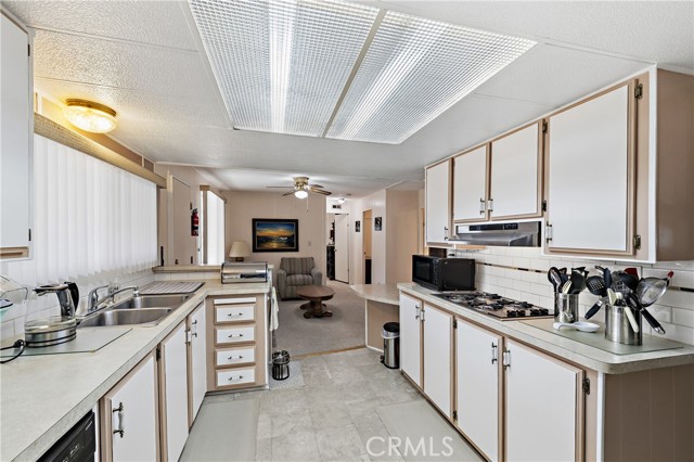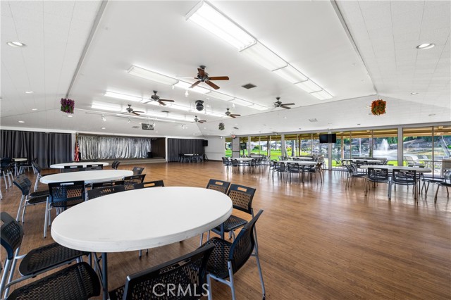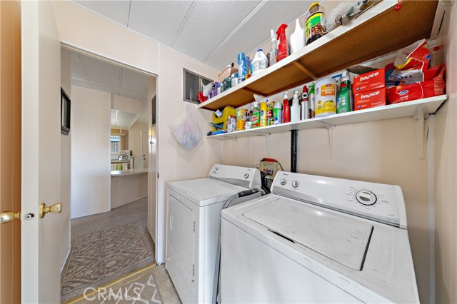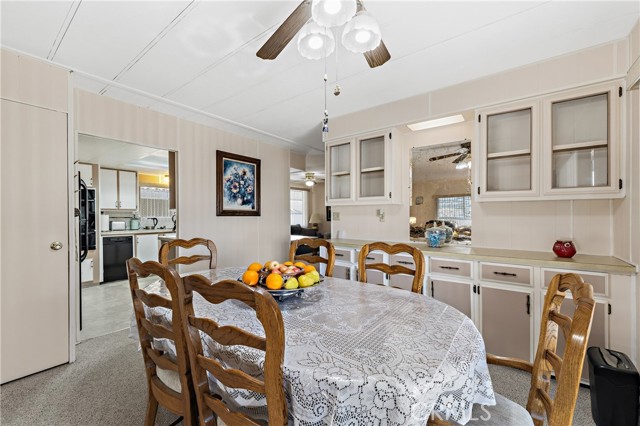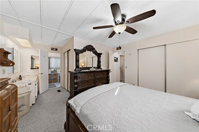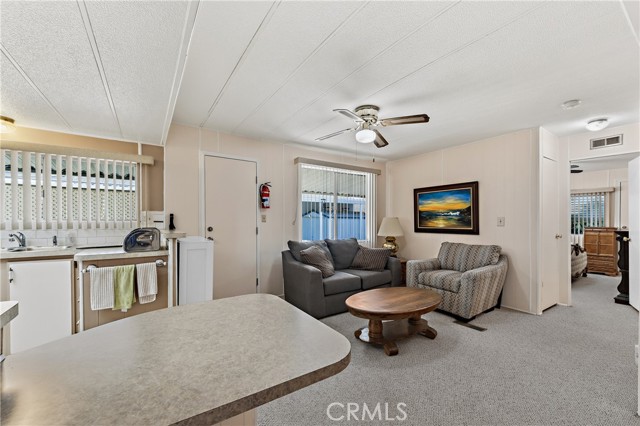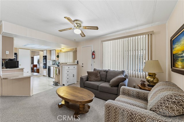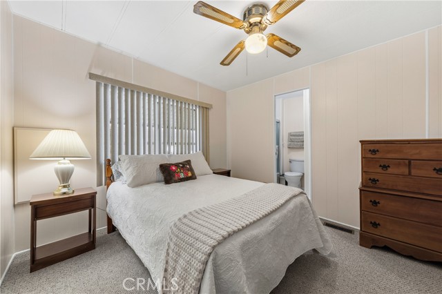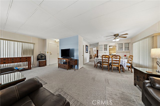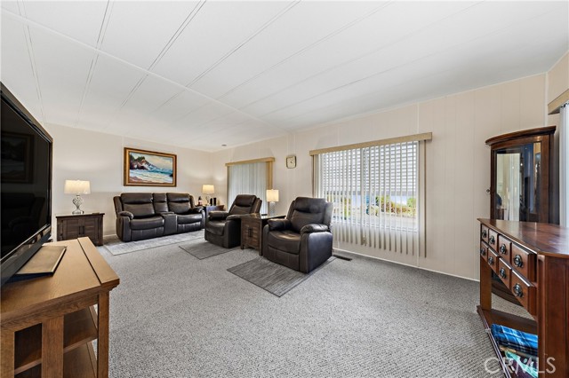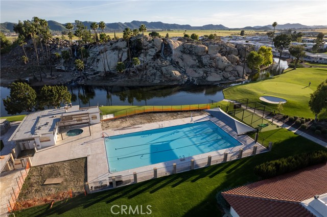 Well-maintained 2 bedroom 2 bath located in scenic The Lakes at Hemet West senior 55+ mobile home park. Formal living/dining combo with low-pile Berber carpet, ceiling fan, and built-in buffet hutch. Galley kitchen has gas cooktop, dishwasher, refrigerator, breakfast bar, and newer gas oven/boiler. Cozy family room with access to raised covered front porch. Master has ceiling fan, two closets, and dual-sink vanity with oversized stall shower. Inside laundry shelving, washer and dryer included. Guest bedroom as en suite full bath also accessible from main living area. Both HVAC and energy-saving evaporative cooling unit. Security screen doors. Roof resealed approximately 3 years ago and home was recently re-leveled. Extra tall carport accommodates higher-rise vehicles. Handicap accessible ramp. Easy-care rockscaping. Bearing fruit trees including navel oranges, loquat, and "cherry" guava. Park amenities include 9-hole par 3 Golf Course, heated pool and spa, indoor shuttleboard court, catch-and-release fishing, pickleball court, bocce ball, horseshoes, picnic area, playground, dog park, and community garden. Clubhouse and banquet room with kitchen facilities, billiard tables, fitness center, ceramics room, library/reading room, and community laundry. Hosted events. Monitored gate access. One of the nicest parks in the valley.