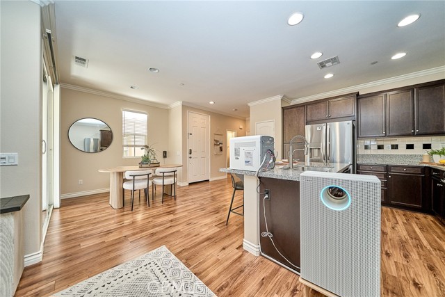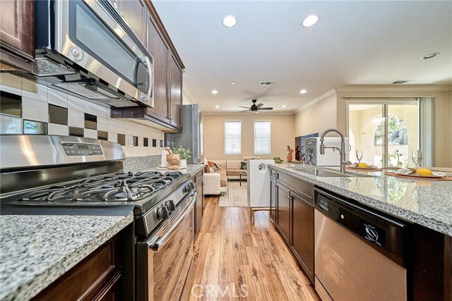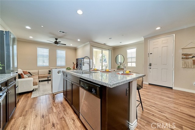 Step inside to a stunning great room showcasing an open concept design, high ceilings, abundant natural light, and elegant laminate flooring throughout. The gourmet kitchen is thoughtfully appointed with granite countertops, an expansive center island, stainless steel sink, rich dark wood cabinetry, stainless steel appliances, and recessed lighting that enhances both form and function.