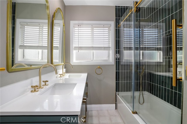 Both bathrooms have been tastefully renovated with striking sage green tilework paired with elegant gold hardware, offering a spa-like feel with a modern edge.