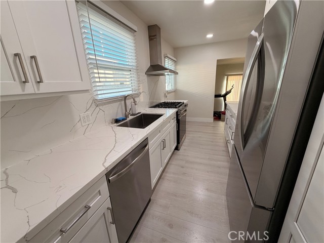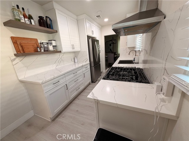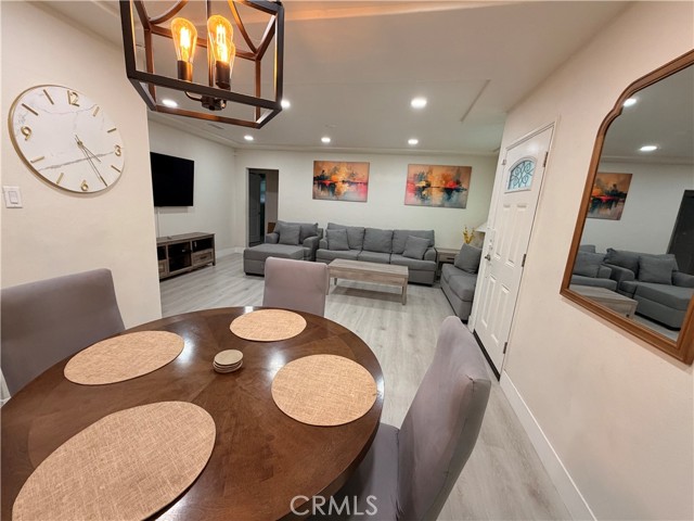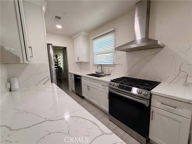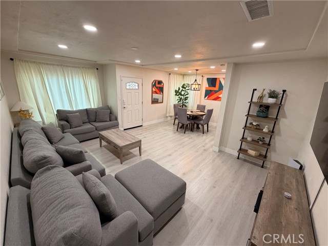 The modern, remodeled kitchen showcases white shaker-style cabinets with ample storage, recessed lighting, and elegant quartz countertops with gray veining. Stainless steel appliances, including a gas stove and range hood, complete the space while a matching quartz backsplash adds a seamless and cohesive design touch. A spacious den provides flexible living options—ideal for a home office, guest room, or potential bedroom. Engineered wood flooring runs throughout the home, adding both style and durability. The remodeled bathroom features quartz countertops and a beautifully updated walk-in shower. Additional highlights include double-pane windows and a fully paid solar panel system for enhanced energy efficiency and long-term savings. The house also comes with a new EV charger and white vinyl fencing. Don’t miss this incredible opportunity to own a thoughtfully upgraded home in Long Beach!