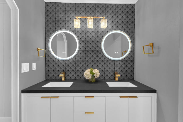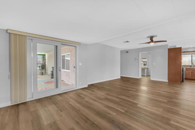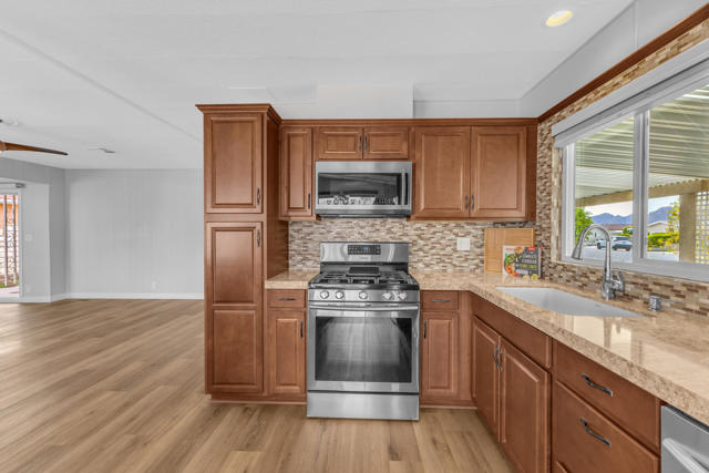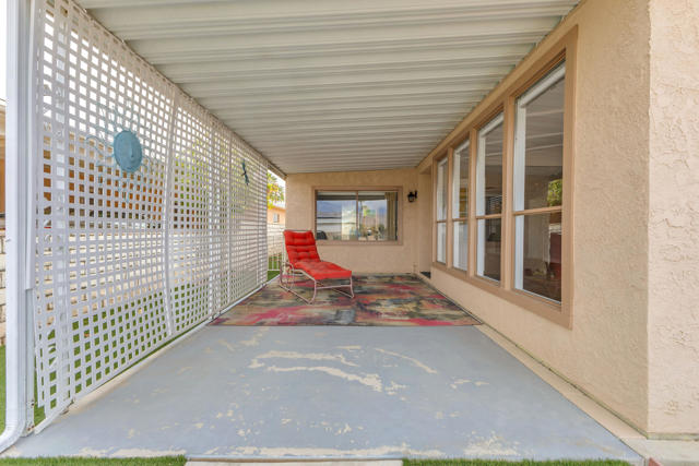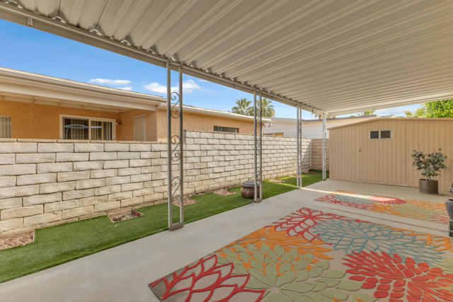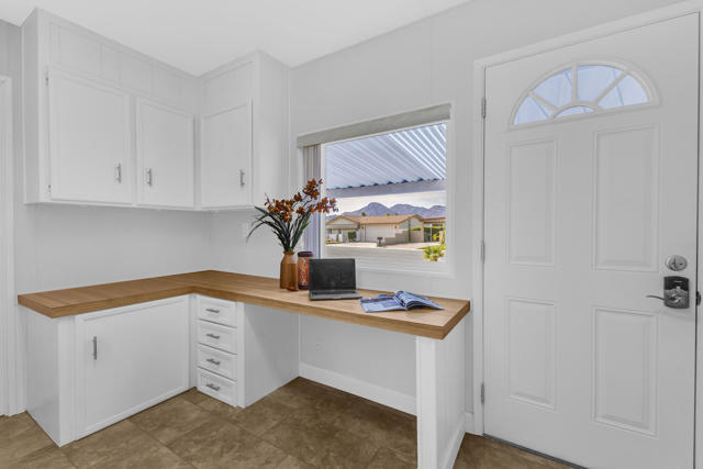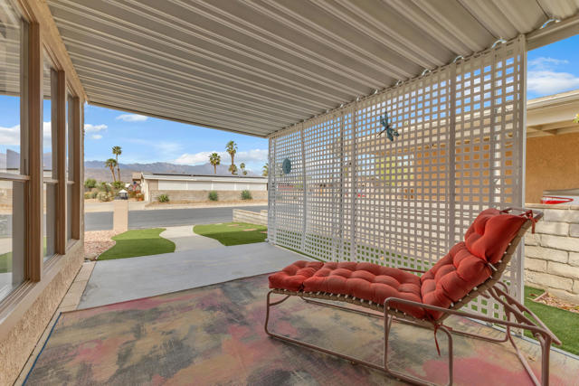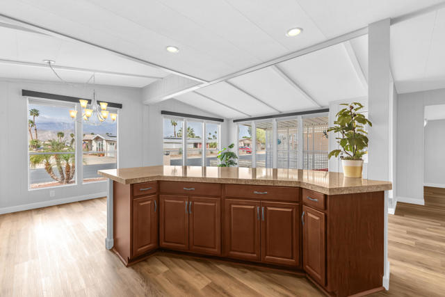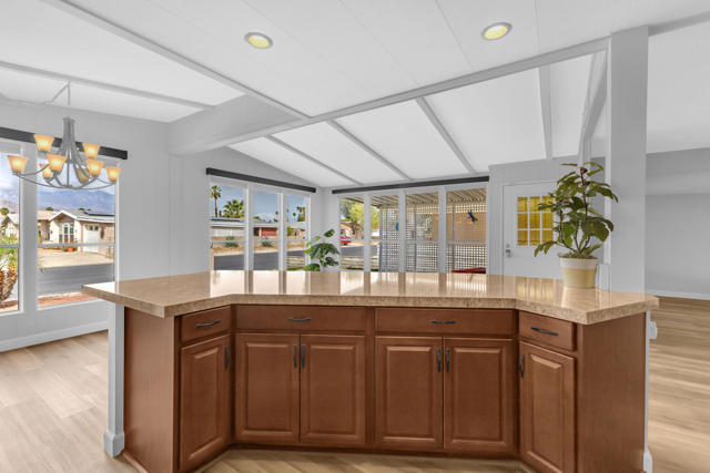 Welcome to easy desert living in the gated 55+ community of Portola Country Club, where the golf is included in the HOA and you own the land (a winning combination!). This beautifully updated 2-bedroom, 2-bath stucco home sits on a rare corner lot and offers gorgeous mountain views, a dual-entry driveway, and parking for two cars plus your golf cart, because in this neighborhood, you'll definitely want one! Step inside to soaring ceilings and a bright, welcoming living room that flows effortlessly into the remodeled gourmet kitchen. With quartz countertops, stainless steel appliances, and a generous island made for gathering, it's the perfect space for everything from casual breakfasts to hosting friends after a round of golf. The spacious primary suite feels like your own private retreat, complete with a spa-inspired bathroom, with a large tile walk-in shower and glass enclosure. The second bedroom is equally inviting and conveniently located next to its own full bath with a tub and shower, perfect for guests or visiting family. A large family room opens to a covered patio and enclosed yard, creating the ideal spot for relaxing, entertaining, or letting your four-legged friend enjoy the sunshine. You'll also appreciate the two storage units and the permanent 433 FOUNDATION, which helps make financing a breeze. Life at Portola Country Club is all about fun, connection, and staying active. The low $440 HOA includes unlimited play on the community's 18-hole par-3 golf course, plus access to the clubhouse, pools, spas, pickleball, and tennis. And when you're ready to venture out, you're just minutes from the fantastic shopping and dining along El Paseo Shopping District and world-class care at Eisenhower Health. It's the perfect blend of comfort, lifestyle, and a little everyday vacation