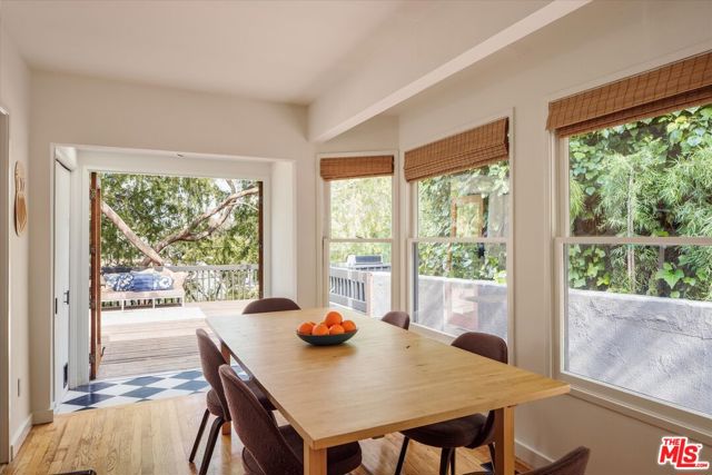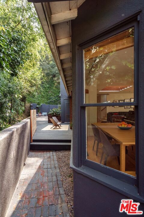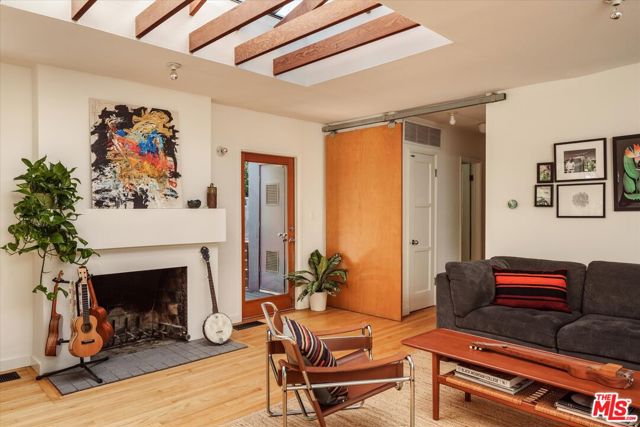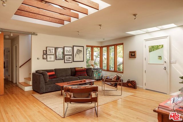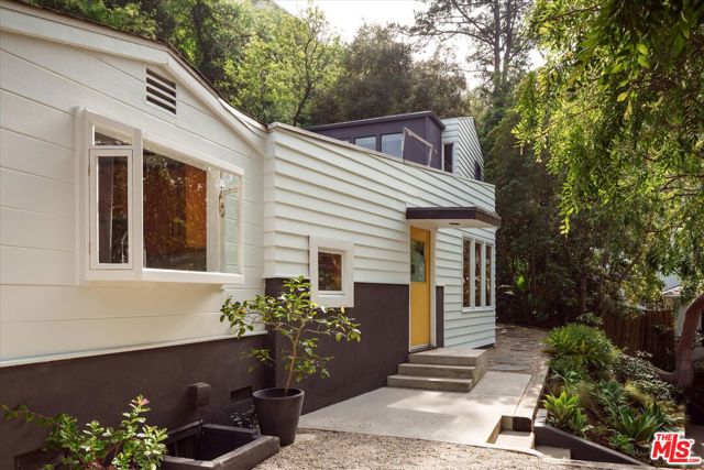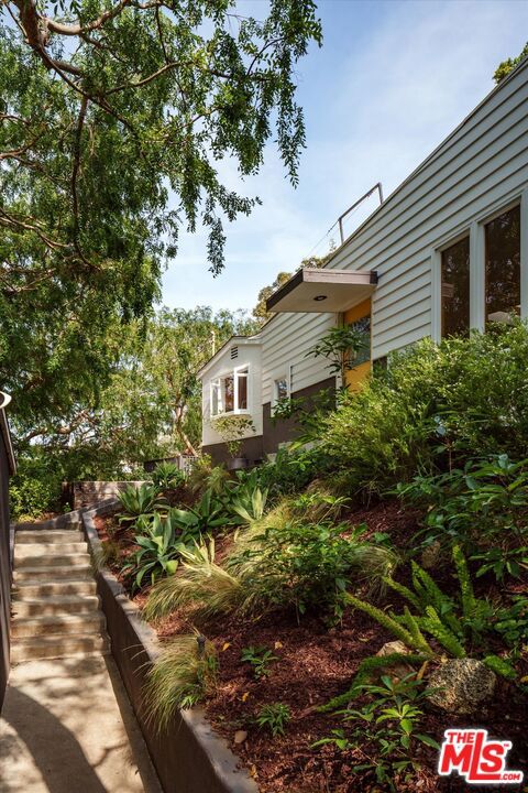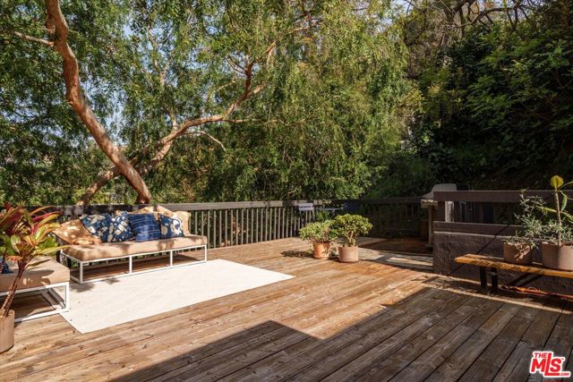 Perched above the street and screened by mature foliage, this mid-century Laurel Canyon treehouse is a peaceful retreat where architecture and nature meet. Built for inspiration, tucked away from view yet moments from the pulse of the city, the design nods to classic mid-century design with subtle aesthetic touches reminiscent of Frank Gehry - skylights, warm natural materials, and light that shifts beautifully throughout the day - creating a seamless connection between indoors and the surrounding canyon landscape. Inside, the house offers three bedrooms and two baths, thoughtfully arranged for easy living - lovely flow of airy common spaces, with 2 bedrooms on the main level and the primary suite and sunroom occupying the entire upper floor. Outside, on an over 9000sf lot, the generous and expansive deck and yard areas are ideal for morning coffee, dinners al fresco, play and rest. From every vantage point, you see layers of green and sky - offering privacy, calm, and inspiration. This is more than a home, it's a creative haven, a peaceful escape, and a rare opportunity to live immersed in the beauty, spirit and wonder of the canyon. There is a detached 2 car garage on street level and ample street parking. Wonderland School District.