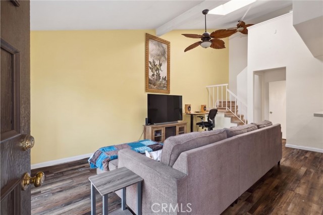 This move-in ready 3-bedroom, 2-bath home offers a bright, open layout with thoughtful updates throughout. The main level features a spacious living room with high ceilings that opens to a private outdoor patio, along with a remodeled kitchen with quartz countertops, stainless steel appliances, breakfast bar, and adjacent dining area. Waterproof luxury vinyl plank flooring runs through the main living spaces, and the home is equipped with ceiling fans and air conditioning for year-round comfort. The lower level also includes a remodeled three-quarter bath and direct access to a private two-car garage. Upstairs are three well-sized bedrooms and a remodeled full bathroom. The community features a large pool with nearby restrooms and outdoor shower, as well as a spacious lawn area.