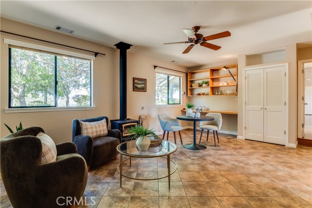 The attached guest unit offers 1 bedroom, 1 bathroom with shower, spacious living/dining area with convenient built-in shelving and cabinetry for a kitchenette or desk area, wood burning stove and separate AC system from the main home.