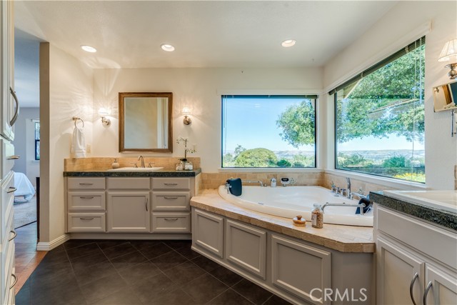 The private bedroom wing of the home boasts the spacious primary suite, two guest bedrooms and a full guest bathroom. In the primary bedroom, unwind with tranquil vistas off the front of the home, with private patio, extensive built-in storage, walk-in closet, and an ensuite bathroom equipped with separate vanities, tub and walk-in shower.