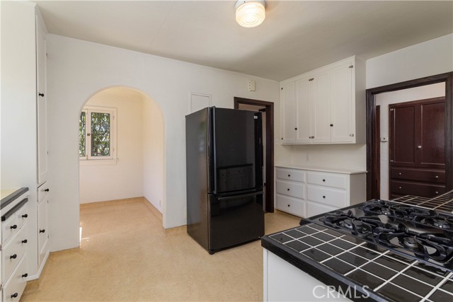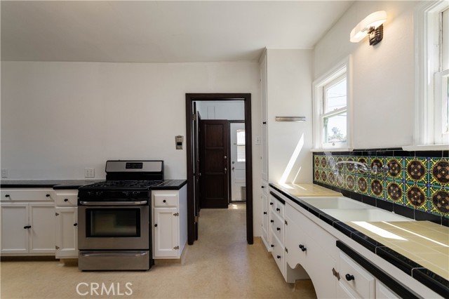This home features a separate dining room, and a separate breakfast nook, both just off of the kitchen. The breakfast nook features beveled glass windows. The sizeable vintage kitchen has the original wood cabinetry, fixtures, and tile countertops. The laundry/mudroom room is adjacent. The flooring is organic Marmoleum.