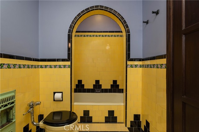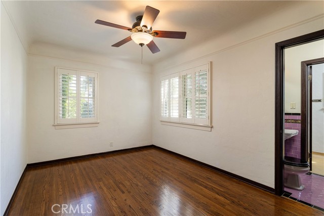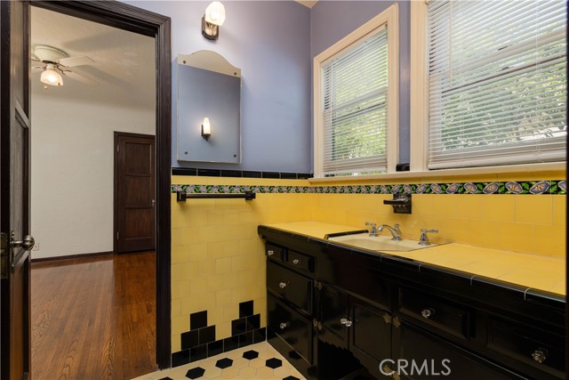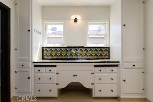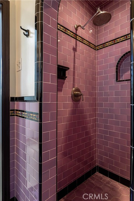 There are 3 bedrooms total, and large hallway with lots of built-in storage cabinets. All 3 bedrooms are larger than you find in most historic homes, with large closets and ceiling fans. The first 2 bedrooms share access to the full bathroom. The full bathroom has stunning original Art Deco tiles, tub and shower, cabinetry and fixtures will have you swooning. Off 3rd bedroom is a smaller Art Deco 3/4 bathroom with shower.