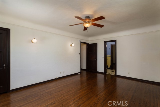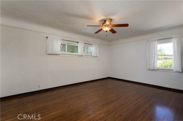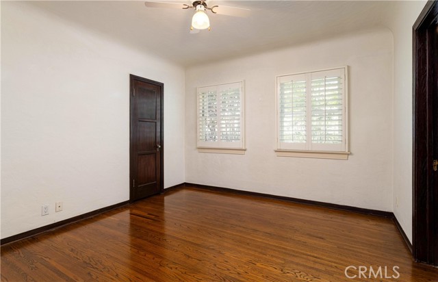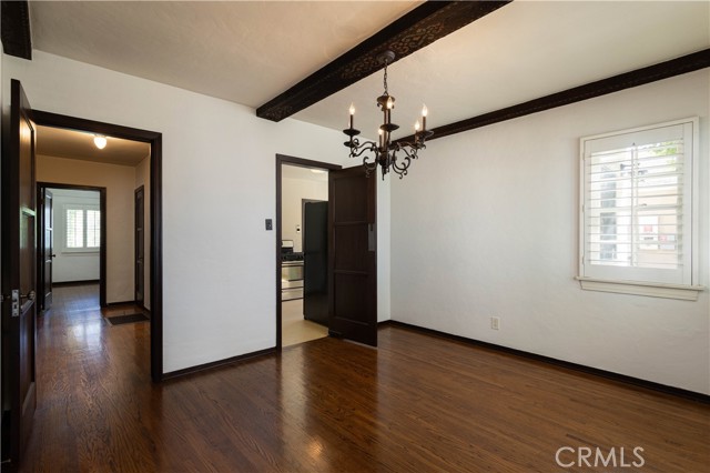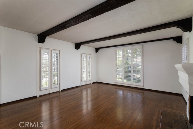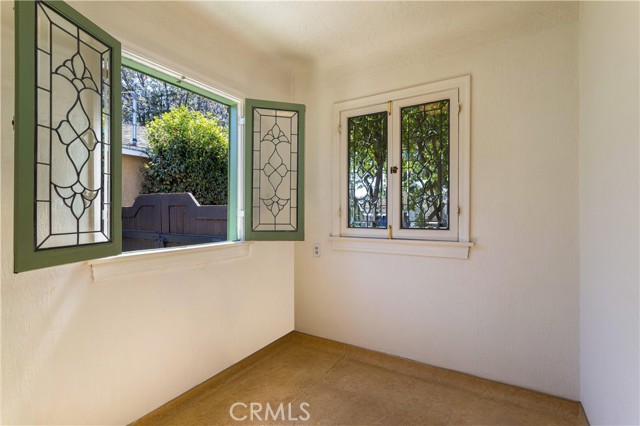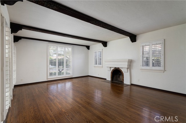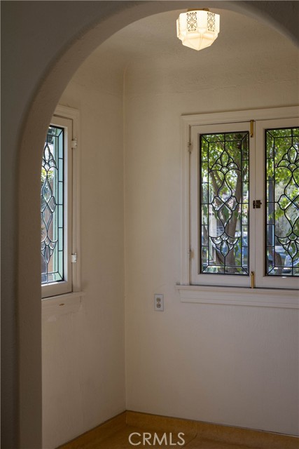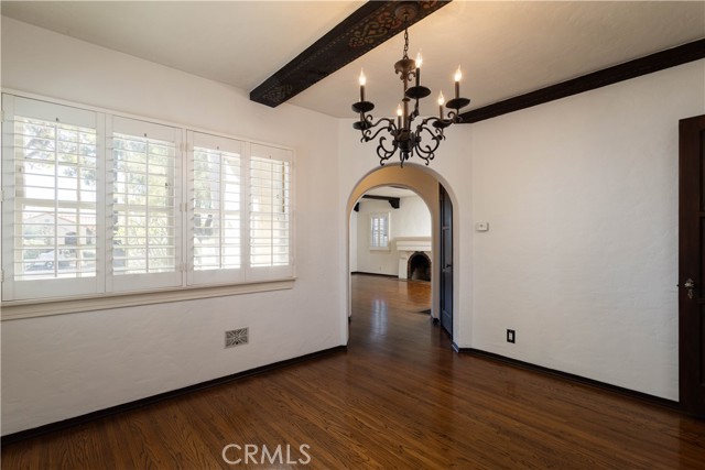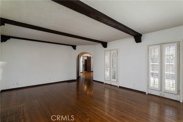 The living room is the crown jewel of this property. The high ceilings have the original decorative stamped wood beams. There is a decorative fireplace with tile hearth. The room is lined with the original wood-framed windows, French Doors and arched front window. Original oak hardwood floors are throughout the property.