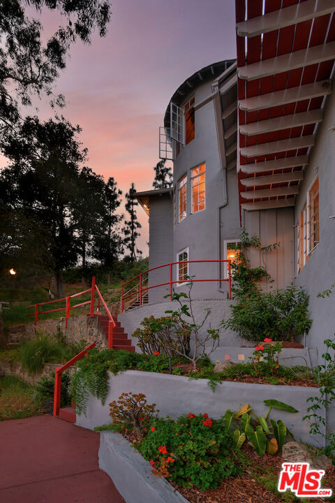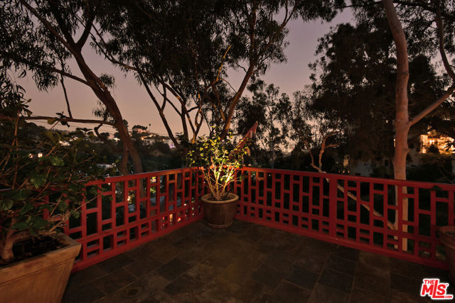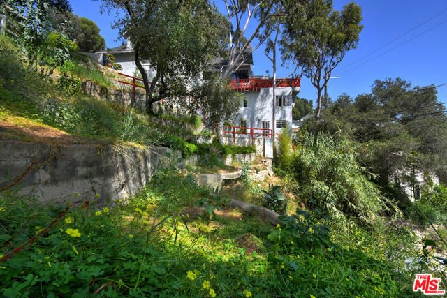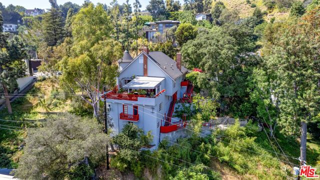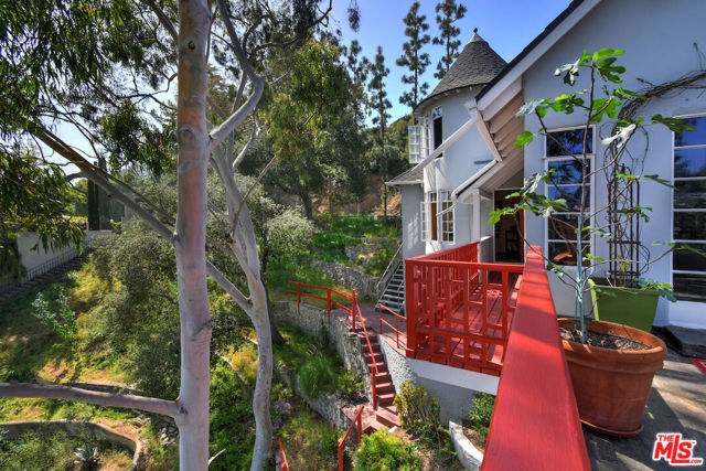Welcome to the famed Hollywoodland enclave, where storybook style lives on today just as it has for over a century. This is a rare opportunity to reside in "The Enchanted Cottage," a historic and whimsical retreat complete with its very own turret. If you have ever dreamed of living in a character-filled home like those found in the fairy tales of your childhood, this is that dream realized. Nestled beneath the iconic Hollywood Sign in Beachwood Canyon, the site offers pure mountainside serenity while remaining only moments away from the city. The glamour of Hollywood's heyday is alive and well in this classic residence, which has been pristinely maintained and thoughtfully renovated. By floating the residence above the embankment like a castle, renowned architect W.L. Schmolle achieved a living environment that affords privacy, security, and stunning hillside views. Upon entering, you are greeted by soaring 14-foot arched ceilings with grand wood beams in a living room anchored by a true wood-burning fireplace and expansive picture windows with views overlooking Griffith Park, the Hollywood Hills and all the way down to the Port of Long Beach. A cozy den offers a quiet respite, while the redesigned chef's kitchen outfitted with an Italian Bertazzoni range, commercial-grade appliances, and stone counters will delight any culinary enthusiast. The formal dining room, featuring fanciful pocket doors, is both rustic and inviting for elegant dinner parties. This space leads to an impressive 450-square-foot, four-season outdoor deck that is half-covered and half-open-air, featuring its own brick wood-burning fireplace and panoramic views in every direction. Old-world craftsmanship is evident in every detail, from the hand-milled black walnut finishes to the leaded glass windows. Behind an obscure door, you will discover a hidden private bar within the turret; climb the ladder to find a circular meditation space and a secret bedroom nestled beneath a skylight for whimsical nights spent sleeping under the stars. The expansive primary retreat offers views from every window, two large walk-in closets, and a Juliet balcony, while the redone main bath features dual marble sinks and heated floors. The property provides ample storage, including an apx. 600-square-foot East Coast-style attic and a wine room with a 170-bottle EuroCave. Additionally, an apx. 800-square-foot lower-level guest apartment featuring a rare, vintage red color O'Keefe & Merritt stove and a clawfoot tub in the full bath offers a private entrance perfect for a home office, creative studio, or potential rental. Outside, a terraced personal park with fruit trees, meandering pathway, a raised-bed vegetable garden, and private patios shaded by a 100-year-old oak tree invites a sustainable lifestyle. A few steps past your next door neighbor you can walk down one of the six hidden, historic 1920"s Stone Beachwood Canyon Steps that brings you to the charming Beachwood Village Square with its shops, grocery market, and the world Famous Beachwood Canyon Cafe. Hiking trails to Lake Hollywood are right outside your front door, as well as close by access to horseback riding at Sunset Ranch Hollywood. A One-of-a Kind Enchanting Retreat-not to be missed. An opportunity like this to own a piece of history doesn't come around every day. Lot next door is 2890 Belden and is priced at $249,000 which is the personal park adjacent to the home.