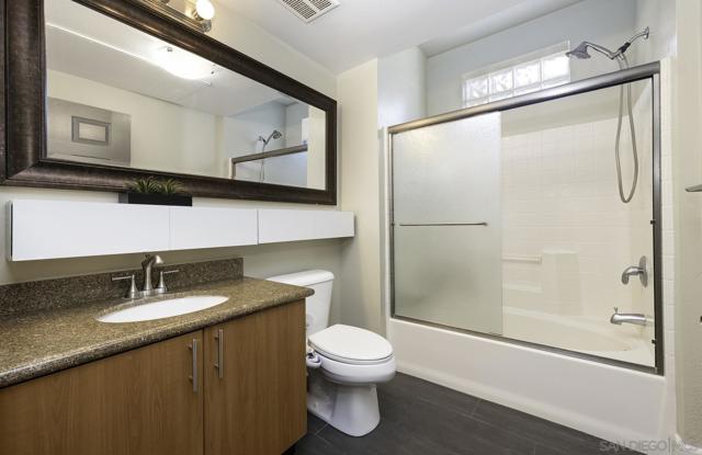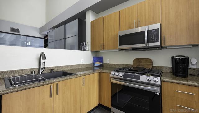 ** 2.75% Assumable VA Loan ** Sleek and unique exude in this "pride of ownership" premium top-floor end unit at Union Square. Tall 18-ft ceilings, this condo lives and feels large. Custom ceramic tile flooring, designer paint, ambient fireplace and expansive windows bringing in tons of natural lights. It's time to call this home. The open kitchen is complete with stainless steel appliances, gas cooking, slab granite and ample cabinetry. Upgraded wardrobe closets are included; perfect for easy organization and storage. Energy efficient Ecobee. Union Square offers a great locale and easy access to the 5, 94 and 163 freeways. Walkable to Petco Park, dining and all kinds of fun nearby. The highly regarded San Diego City College, Downtown Library are also within walking distance and so much more of what Downtown has to offer. The amenities included at this community are: fitness center, clubhouse, jacuzzi, sauna, barbeque and gated building with scenic courtyards with water features. You will love where you live!
