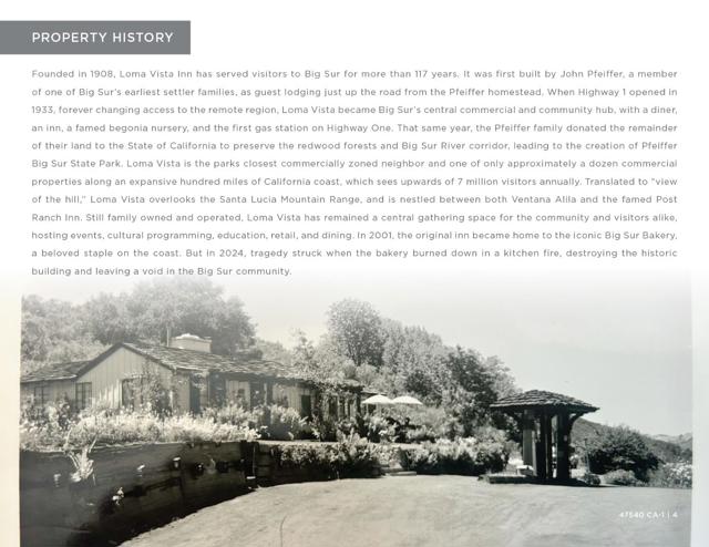 Located at 47540 Highway 1 in Big Sur, California lies the iconic Loma Vista Inn & Gardens. This commercial zoned property is 3.49 acres and consists of an operating Shell gas station (business included in sale), multiple retail storefronts (month to month leases), and a quintessential Big Sur wedding venue (business included in sale). For decades, there was a restaurant on the property, but that building was burned down in 2024. That structure was removed and a gravel pad remains today. This opportunity allows for a Buyer to continue running the gas station and wedding venue business, lease out the property, rebuild the restaurant building or redevelop the property entirely.