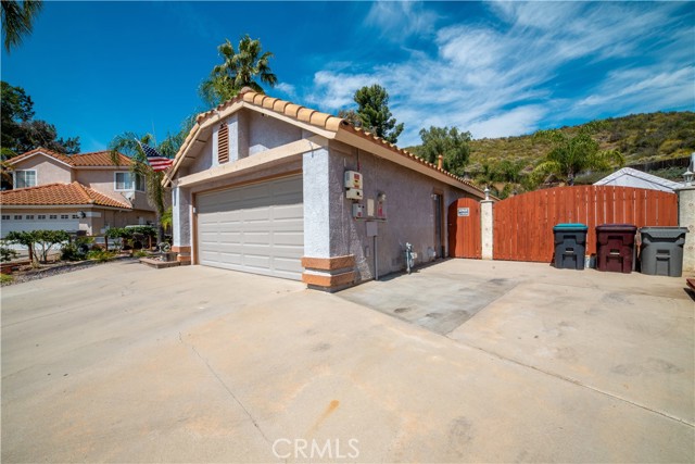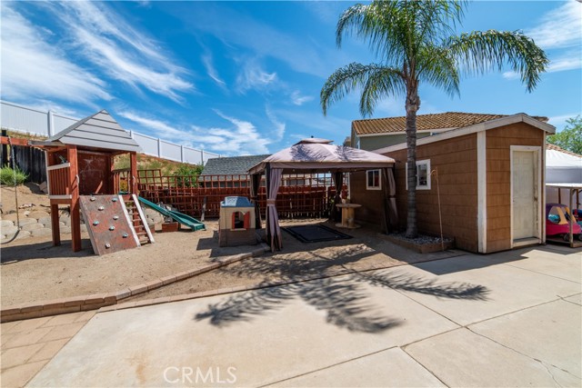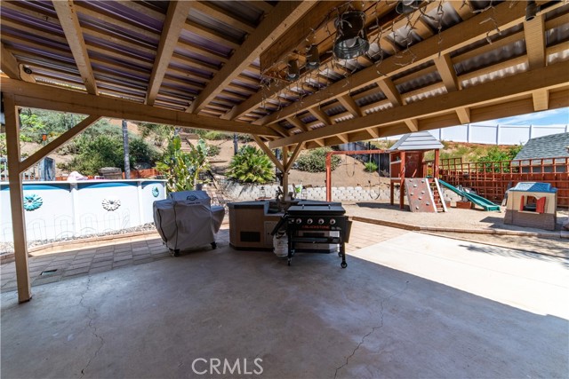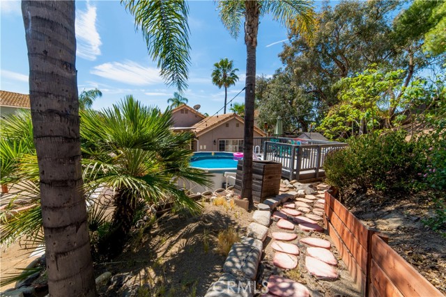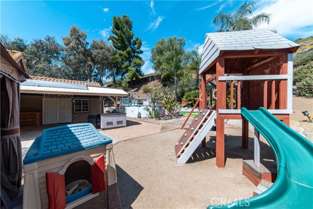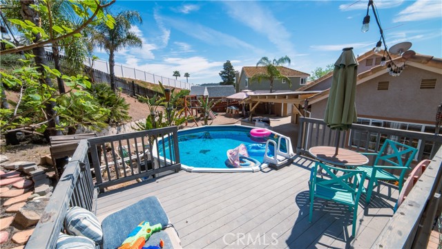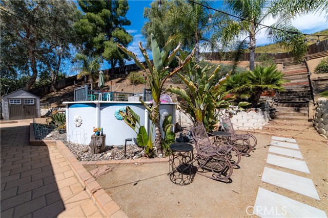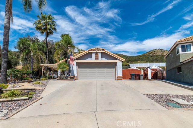 Sprawling view of Temecula Valley and Palomar Mountains! Great Family Home on over 1/4 acre (.31) on a cul-de-sac! Features garden, aboveground pool, playset w/slide & lookout, firepit, toy/bike corral, courtyard, and RV/boat parking. Get cookin’ in the open kitchen, all stainless-steel appliances,5 burner range, granite countertops, stone backsplash, large wood pantry cabinets, bar top and terracotta tile continue into large family room with custom built-in shelving, desk and French doors that lead to the covered patio and terraced backyard. Backyard features string lighting, concrete retaining wall, long stairway to hilltop plateau rising 20 ft in elevation, above ground pool with custom deck built into the hillside, garden with irrigation, shade trees, workshop, BBQ island, concrete and pavers throughout with stone path to hillside plateau and pool. Back inside with floating light brown hardwood floors and two-tone walls throughout the living and dining rooms with a gas fireplace. All three bedrooms were updated with engineered espresso hardwood flooring and fresh paint. The master bedroom has vaulted ceiling with shelving, large his and hers sliding mirror closet doors, and sliding door to patio. Ensuite with vaulted ceiling renovated with paint, large format tile, and resurfaced his/hers cultured marble countertop and large 60x42 soaker tub/shower, two large his and hers mirrors. Second bedroom two separate closets with built-in desk and shelving. Third bedroom new custom bifold Barn closets doors with shelving and shelving above closets. The second bathroom has tiled flooring and a custom tiled shower with tub, and two medicine cabinets. The laundry room has electric and gas hookups and leads to the two-car garage. The garage has an insulated panel garage door, high-capacity outlets and 6 large storage cabinets, side door, and access to a garage attic space for more storage. The front yard features custom landscaping, courtyard, and plenty of parking. Space to add In-law suite, fitness/activity room or other and no one building behind you. The garden boasts two blueberry bushes, green grapevine, chives, two tomato plants, and sweet & red potatoes plants.