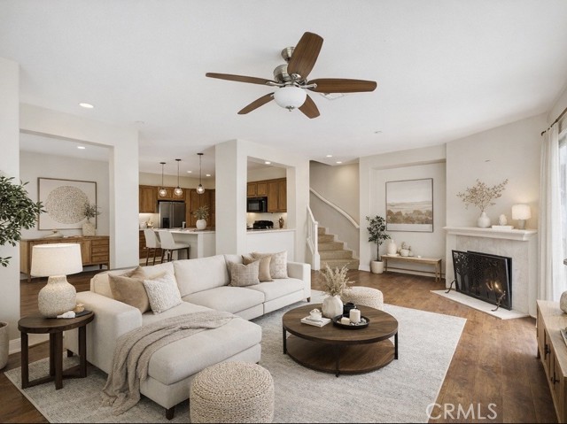 The living area feels open and welcoming, with a layout that flows easily into the dining space and kitchen. The kitchen includes ample cabinet storage, a center island, and a functional setup that works well for both everyday living and entertaining.