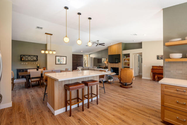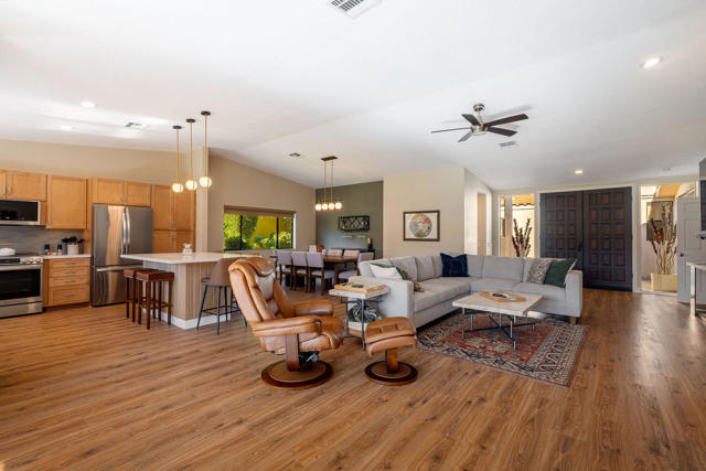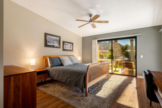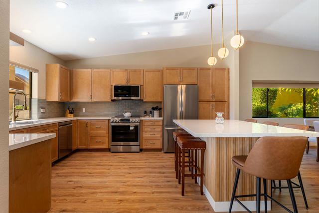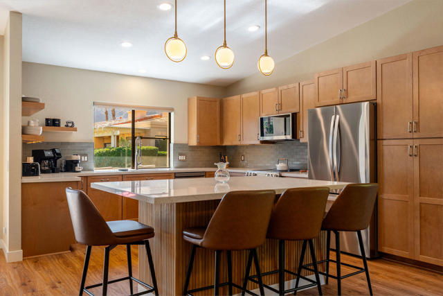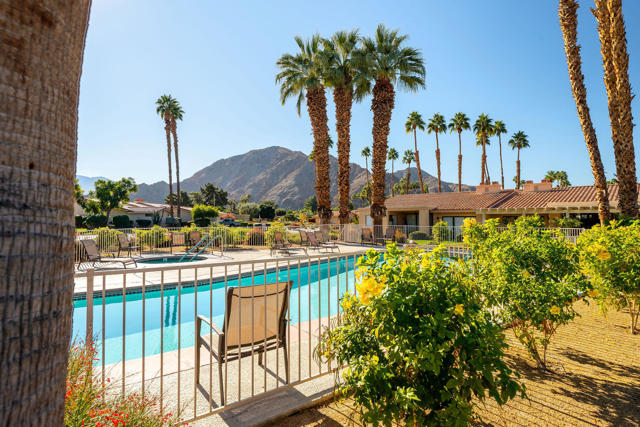 Indian Wells, Casa Rosada in gated Mountain Cove. 3 bd. 3 bth condo with south- facing patio showcasing the Little Santa Rosa mountains. Entry gate opens to the newly paved courtyard with wooden double doors opening into the fully remodeled interior. Quality renovation in a stylish, modern, open design. Waterproof Luxury Vinyl wood flooring throughout; new cabinetry, quartz counters, kitchen island for 6. All new fixtures and appliances. Large primary ensuite with standing tub and generous master closet. Guest ensuite and 3rd bedroom with adjacent hallway bath creating a private second guest opportunity. The south-facing patio is steps to the main heated pool and spa. HOA covers landscaping, exterior maintenance including roofs, painting and pools. This roof replaced approx. 3 yrs ago. There are 4 pools and spas within this 50-unit complex. Drive your golf cart to the Indian Wells Country Club, the tennis garden or two of the city owned golf courses. As an Indian Wells resident, you enjoy low golf fees, free access to the Hyatt work-out Facility and 20% discount on restaurants in the hotels. Also enjoy one free day at the BNP Paribas Tennis tournament and other perks. Lower priced electricity through Imperial Irrigation. Come and immediately enjoy the special Indian Wells Lifestyle! Showings to begin on April 6, 2026.