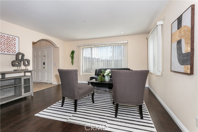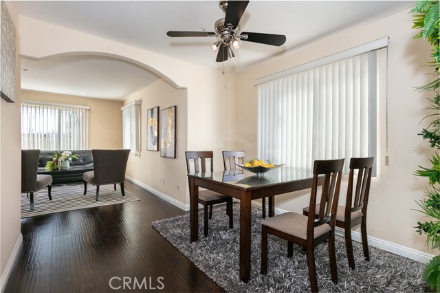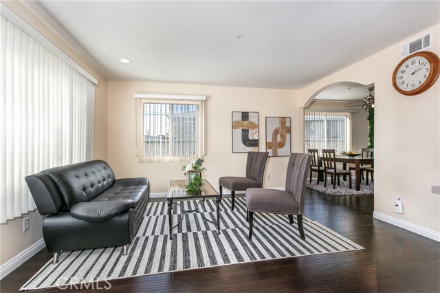 The living room features high vaulted ceilings and large windows that allow ample natural light. An arched opening connects the space to the dining room, creating an open flow ideal for casual gatherings.