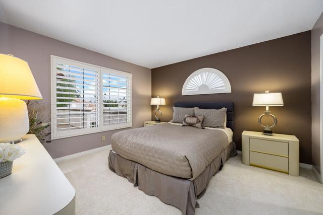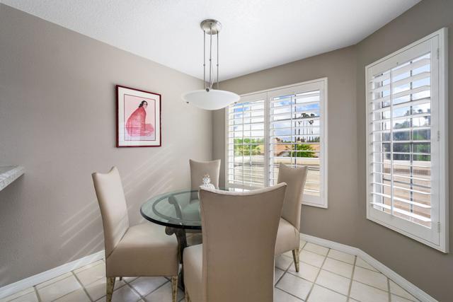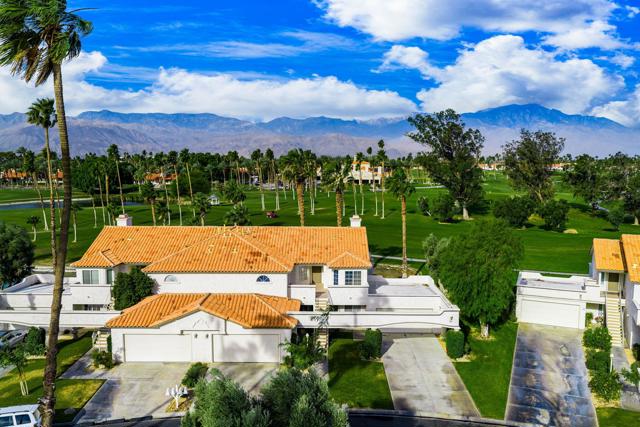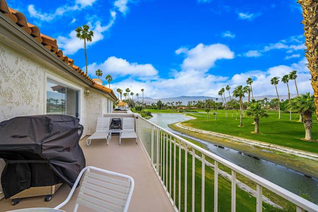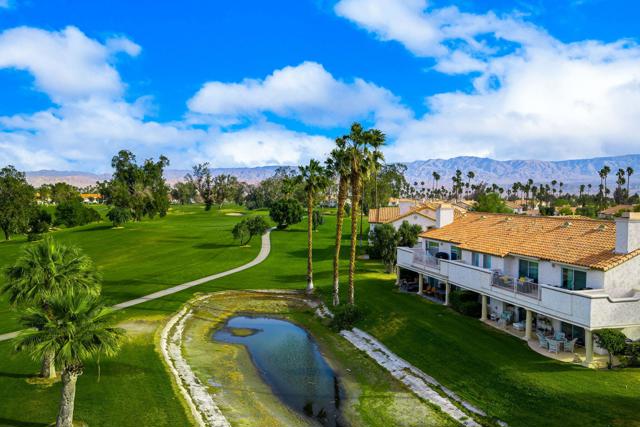 Elegant upgrades define this completely remodeled, substantially furnished upper-level condo in Desert Falls Country Club. Offering 3 bedrooms and 2.5 baths, this beautifully updated home blends refined finishes with sweeping golf course, lake, and mountain views.The remodeled kitchen features rich espresso cabinetry with a subtle wood-grain texture and satin finish, paired with white speckled granite countertops, matching backsplash, and stainless steel appliances. A sunny breakfast nook wrapped in windows welcomes the morning light.The front third bedroom has been thoughtfully converted to a den, complete with custom built-in cabinetry and floating glass display shelves. In the primary suite, the spa-inspired bath showcases slab marble floor-to-ceiling shower walls, slab marble countertops with a waterfall edge extending to the tub surround, custom cabinetry, and marble flooring. The powder room makes a bold design statement with its natural-edge terracotta-toned granite countertop, vessel sink, dramatic veining, and polished finish.The junior ensuite bedroom offers a walk-in closet and a beautifully remodeled bath with granite countertops, granite flooring, and a floor-to-ceiling granite surround at the tub/shower.Updated lighting and plantation shutters throughout add style and sophistication.Outside, the front balcony offers opportunities for dining and relaxing with the morning sun or afternoon share. The expansive rear patio spans the full length of the condo and captures breathtaking views across multiple fairways, sparkling lakes, and dramatic mountain backdrops.A rare opportunity to enjoy elevated desert living in one of Desert Falls' most scenic settings. Located minutes from El Paseo, fine dining, and world-class retail. Close to the Acrisure Arena--home of the Coachella Valley Firebirds and a venue for major concerts and events. The privately owned Desert Falls Country Club offers pay-as-you-play or membership options. Short-term-rentals are approved in Desert Falls Villas.