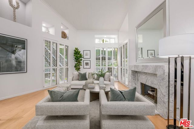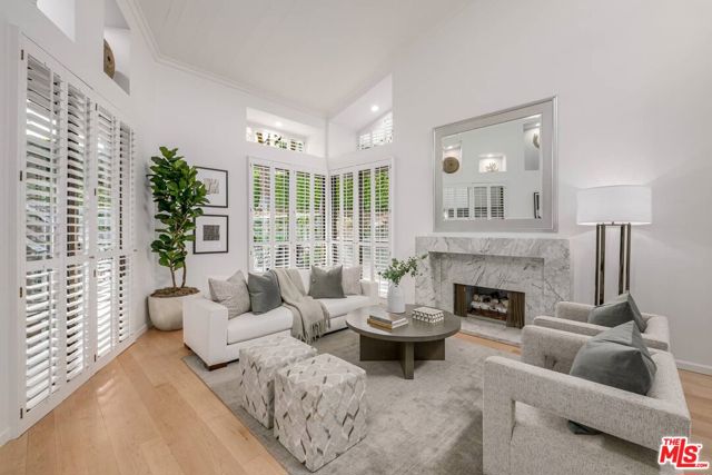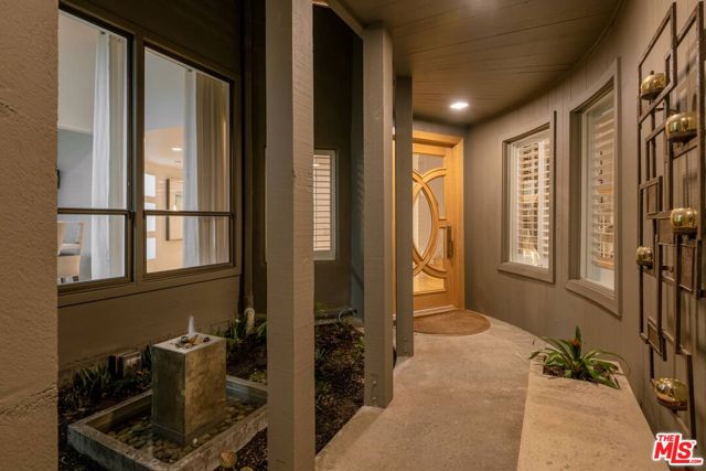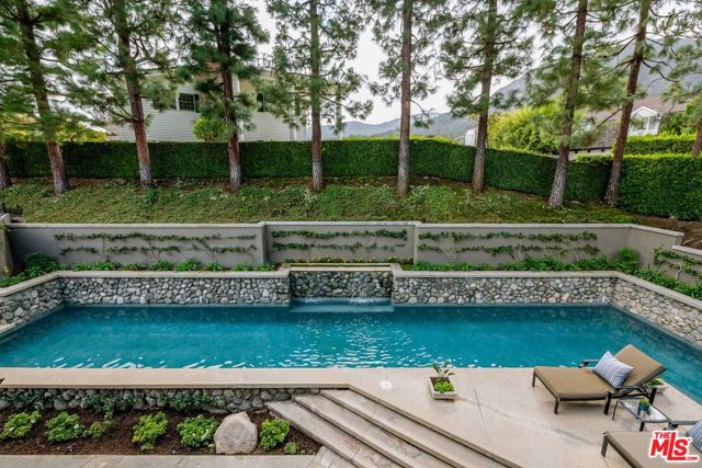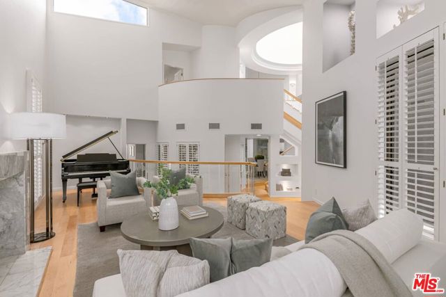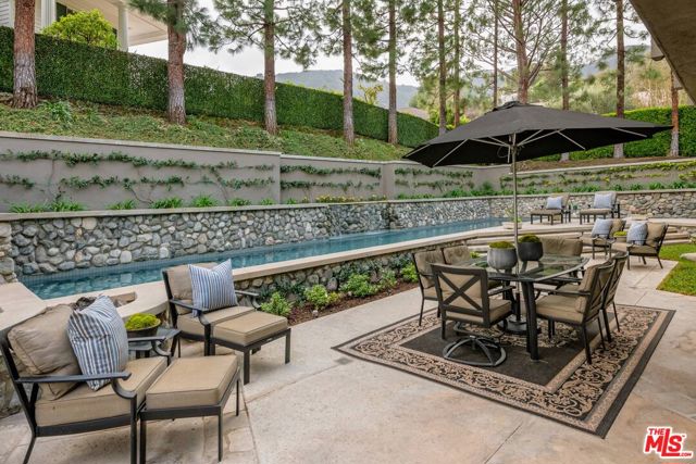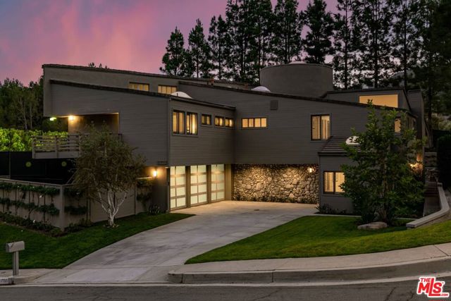 Set on more than half an acre behind the 24-hour guard gates of Palisades Country Estates, 17765 Camino De Yatasto is a striking architectural residence by Steinbrueck + Dianella, blending privacy, scale, and resort-style amenities in one of Pacific Palisades' most coveted enclaves. Spanning nearly 5,500 square feet with 5 bedrooms and 4.5 baths, the home makes an immediate impression with bold lines, a dramatic silhouette, glass-paneled garage doors, stone detailing, and a serene courtyard entry with tranquil water feature. Inside, soaring ceilings, curved walls, sculptural forms, art niches, and a dramatic circular skylit rotunda create an interior that feels both expansive and architecturally distinct. The formal living room is bright and elegant, centered around a marble fireplace and framed by towering windows, while the formal dining room overlooks the central volume and connects seamlessly to the home's entertaining spaces. The kitchen is generous in scale and function, appointed with top-tier stainless appliances, extensive cabinetry, black stone counters, a large center island with cooktop, and an adjacent breakfast area. Nearby, the family room offers a more relaxed setting with exposed beams, a striking fireplace, full wet bar, and direct access to the outdoor entertaining areas. Additional flex spaces provide versatility for office, gym, study, or creative use. Upstairs, the primary suite unfolds as a private retreat with exceptional scale, its own fireplace, sitting area, balcony access, beverage bar, oversized walk-in closet, and a beautifully renovated spa bath with dual vanities, freestanding soaking tub, and large glass shower. Secondary bedrooms are spacious and thoughtfully designed, while updated baths, dedicated laundry, and additional upstairs workspace enhance everyday livability. Outside, the grounds live like a private resort, with a long swimmers pool and spa, waterfall, multiple lounge and dining terraces, built-in BBQ, covered entertaining areas, and one of the few private full-size tennis courts in the community, all set against a lush hillside backdrop. By day, the property offers privacy, recreation, and architectural presence; by night, it becomes a dramatic retreat defined by glowing interiors, illuminated grounds, and an exceptional indoor-outdoor lifestyle. With a 3-car garage, generous additional parking, and close proximity to Palisades Village, hiking trails, and the coastline, this is a rare opportunity to own a residence of true architectural character in an exceptionally private guard-gated setting.