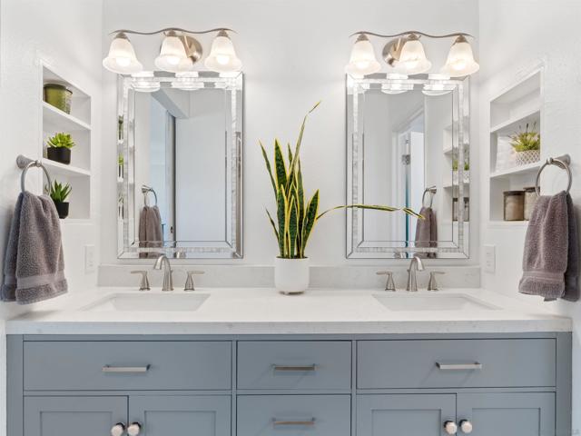 Welcome to this beautifully remodeled home in the highly desirable Calavera Hills community—perfect for families, retirees, or savvy investors. Set on a premium canyon lot, it offers scenic views, modern upgrades, and comfortable, low-maintenance living with broad appeal and lasting value.This 3-bedroom home in The Crest has two bedrooms on the entry floor, offers privacy, views, and true indoor-outdoor living with new pavers and turf. Updates include a fully remodeled kitchen with farmhouse sink and new refrigerator, newer appliances, luxury vinyl plank flooring, custom Italian marble tile, stone-topped vanities, newer windows and slider, and new heater/AC, fresh paint, whole home water filtration system - One Water Systems, Elite 15 Series and fresh paint. The oversized primary suite features a custom barn door and built-in closet system. Enjoy the remodeled laundry area with newer washer and dryer, large outdoor storage PLUS expanded and finished attic for even more storage. With a low HOA and a prime location walkable to Hope Elementary, Calavera Park, and local hiking trails, this home has it all.
