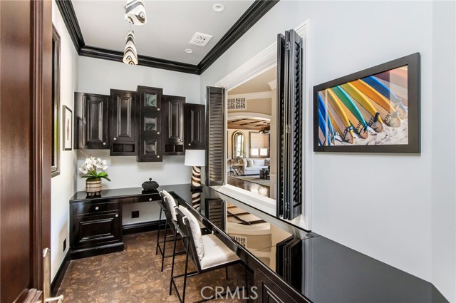 The upper floor of the home with beautifully drawn light throughout showcases grand-scale living spaces including the formal living room and upper family room, two fireplaces and outdoor decks with sunset views of the ocean. This level also includes an office/bedroom, dining room, a chef’s kitchen equipped with an imported La Cornue French gas range, high-end appliances, and a butler’s pantry. French doors open up to an outdoor covered lanai overlooking the backyard pool area below with a fireplace, TV, built-in BBQ and ample room for seating.